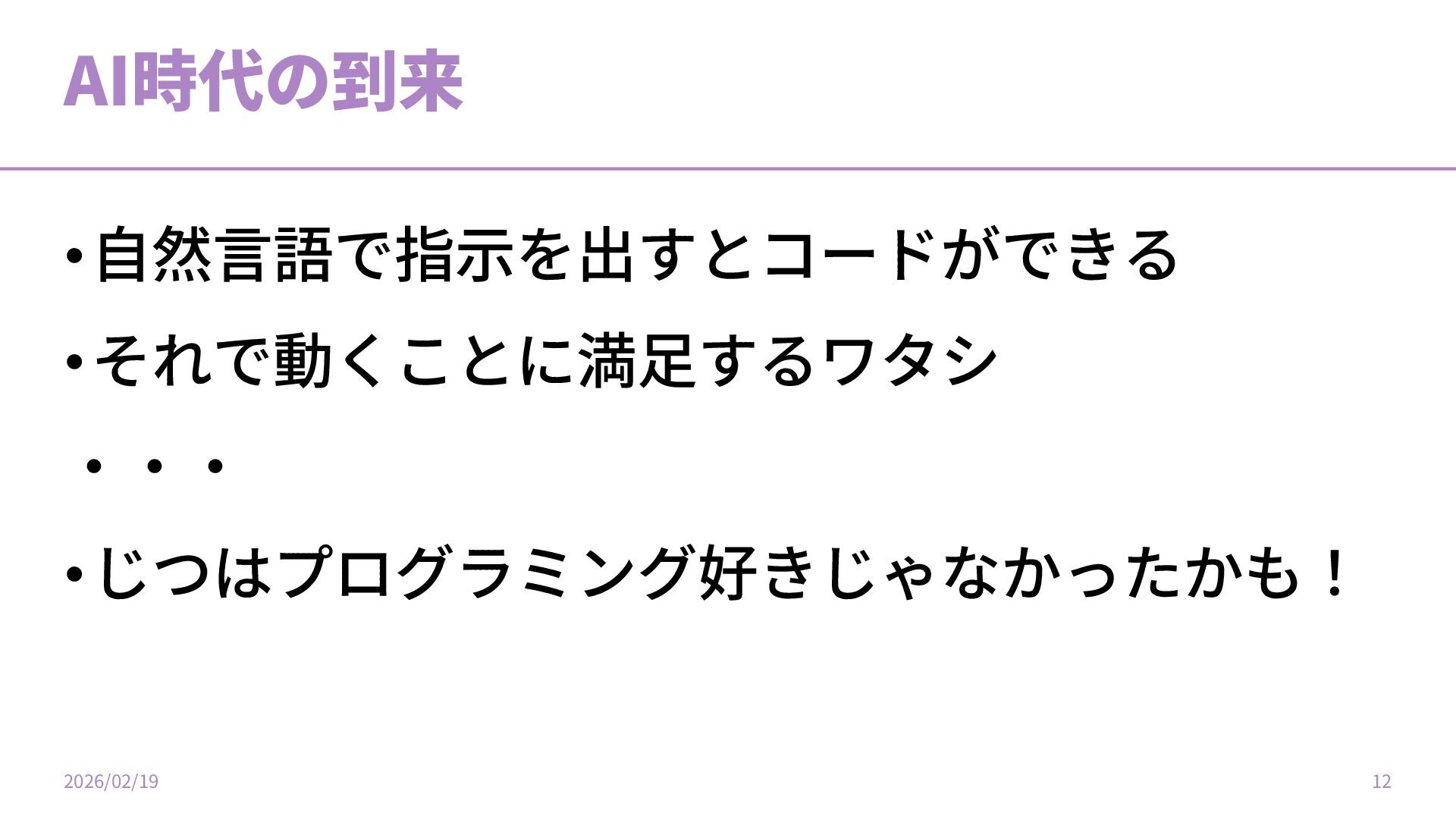 AI時代の到来 •⾃然⾔語で指⽰を出すとコードができる •それで動くことに満⾜するワタシ ‧‧‧ •じつはプログラミング好きじゃなかったかも! 2026/02/19 12
