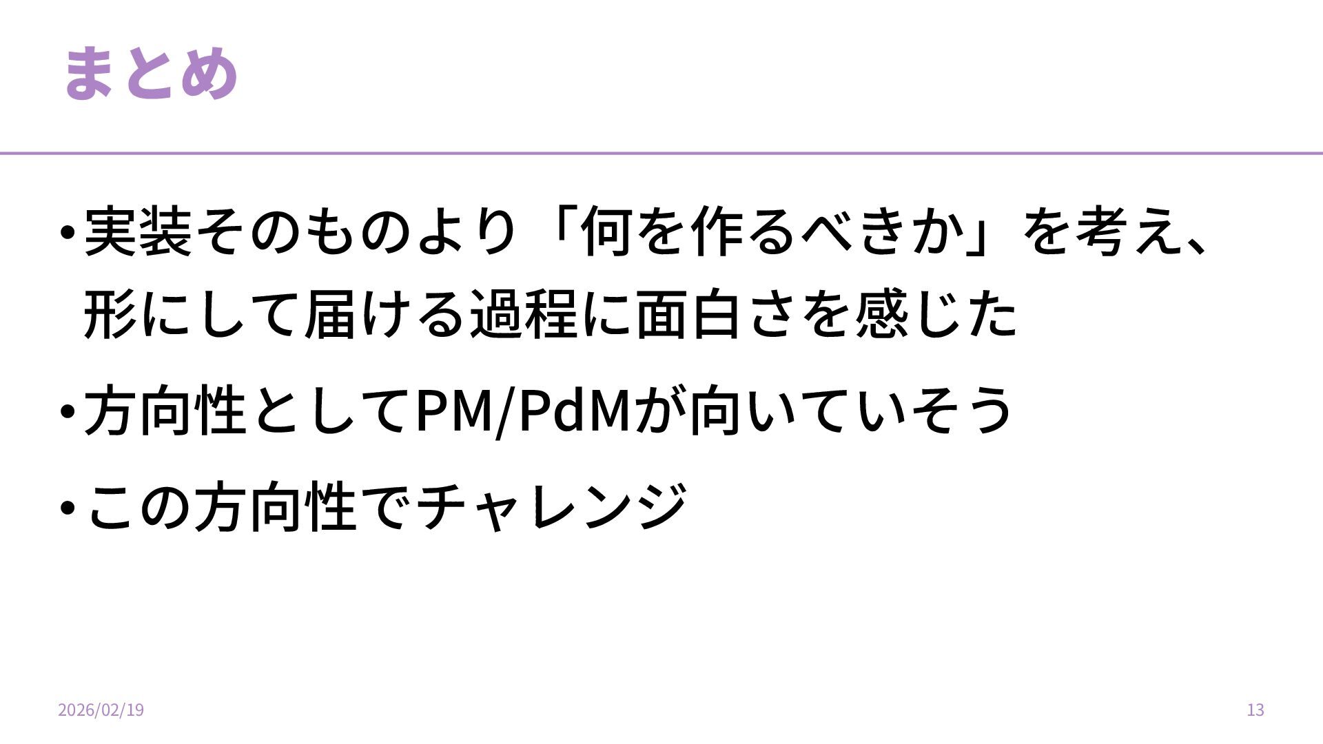 まとめ •実装そのものより「何を作るべきか」を考え、 形にして届ける過程に⾯⽩さを感じた •⽅向性としてPM/PdMが向いていそう •この⽅向性でチャレンジ 2026/02/19 13