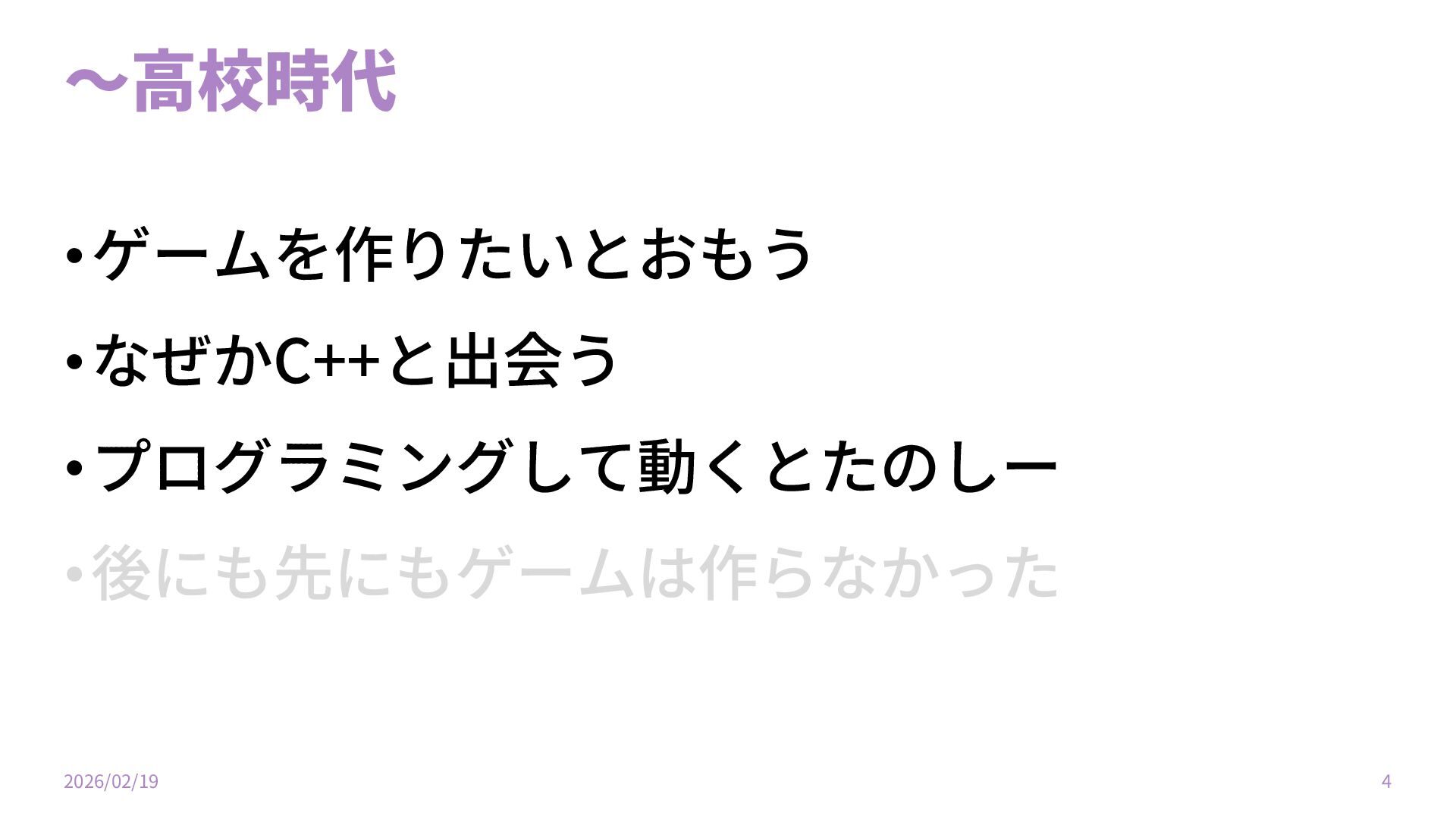 〜⾼校時代 •ゲームを作りたいとおもう •なぜかC++と出会う •プログラミングして動くとたのしー •後にも先にもゲームは作らなかった 2026/02/19 4