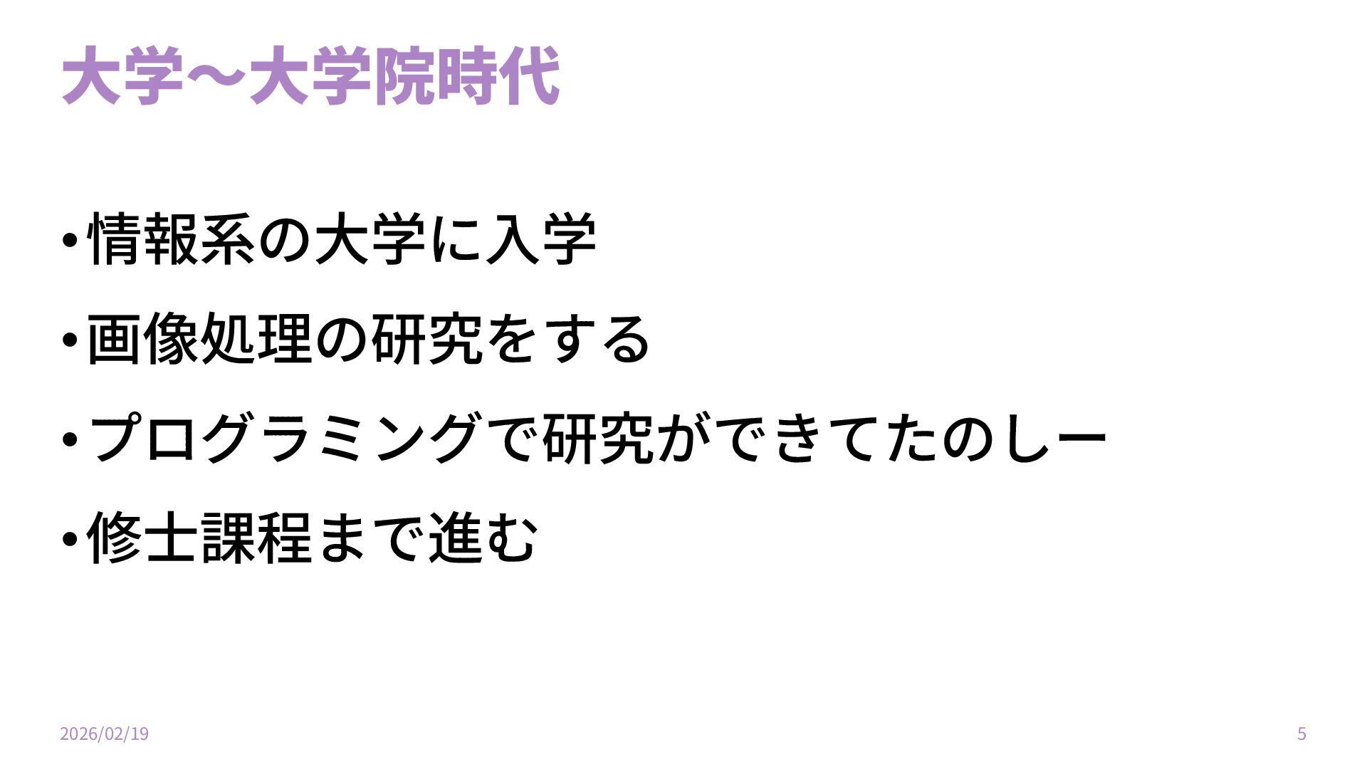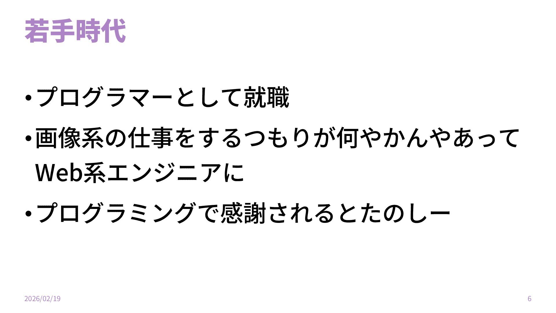 ⼤学〜⼤学院時代 •情報系の⼤学に⼊学 •画像処理の研究をする •プログラミングで研究ができてたのしー •修⼠課程まで進む 2026/02/19 5