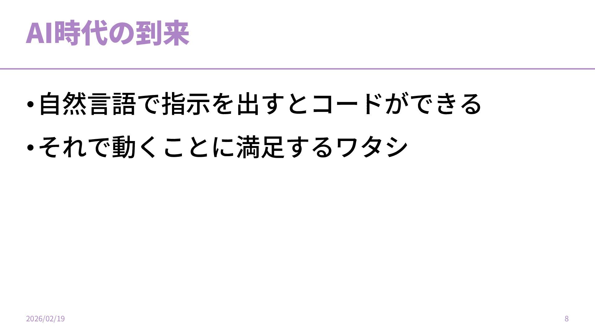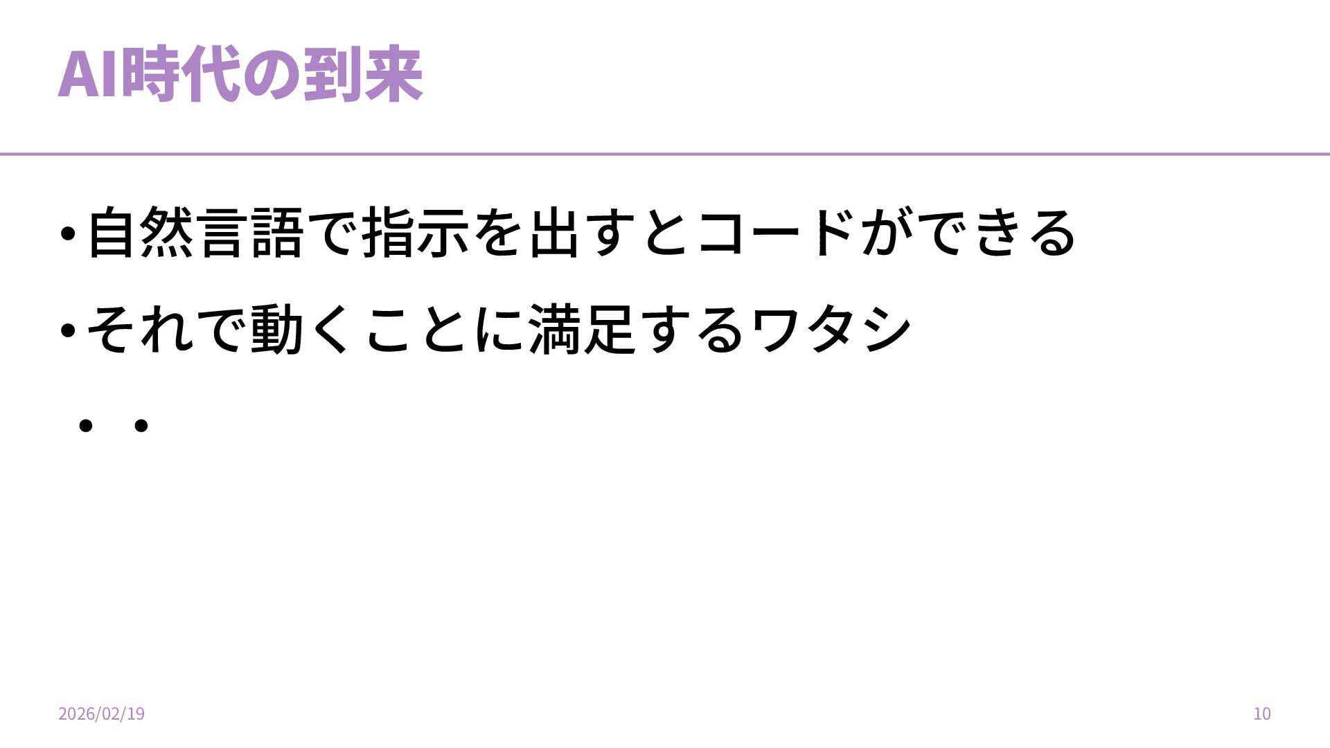 AI時代の到来 •⾃然⾔語で指⽰を出すとコードができる •それで動くことに満⾜するワタシ ‧‧ 2026/02/19 10