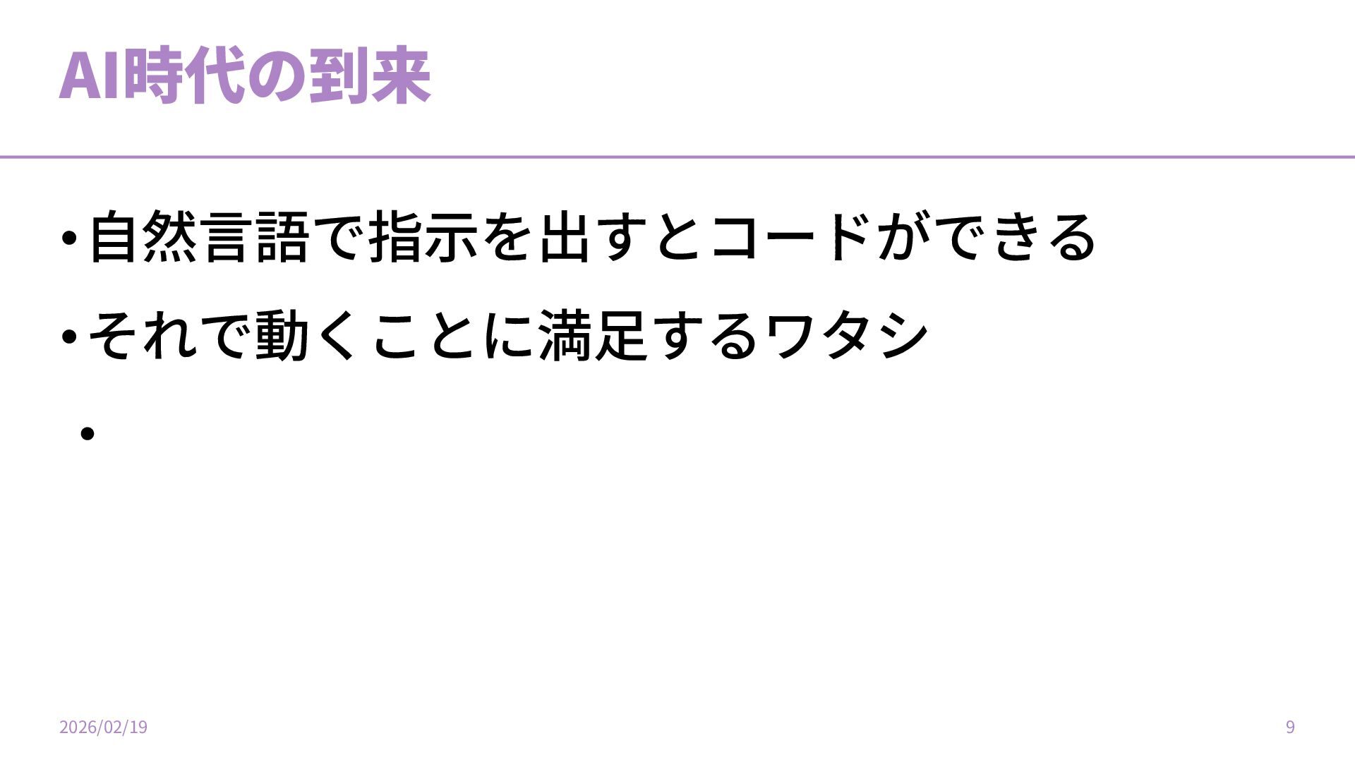 AI時代の到来 •⾃然⾔語で指⽰を出すとコードができる •それで動くことに満⾜するワタシ 2026/02/19 8