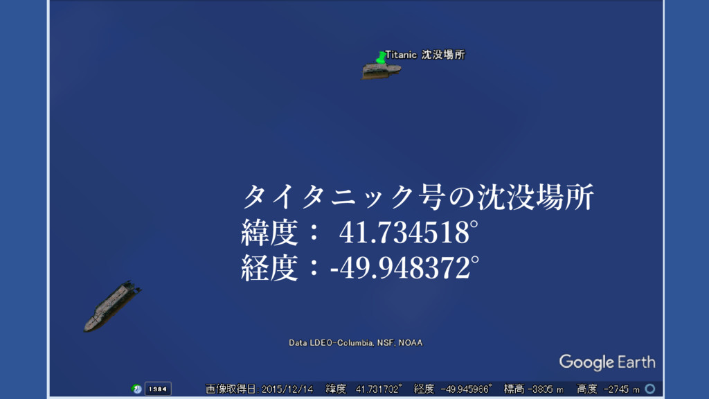 タイタニック号の沈没場所 緯度: 41.734518° 経度:-49.948372°