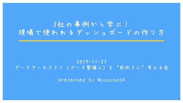 3社の事例から学ぶ! 現場で使われるダッシュボードの作り方 2019-11-27 データアーキテクト(データ整備人)を“前向きに”考える会 presented by @yuzutas0