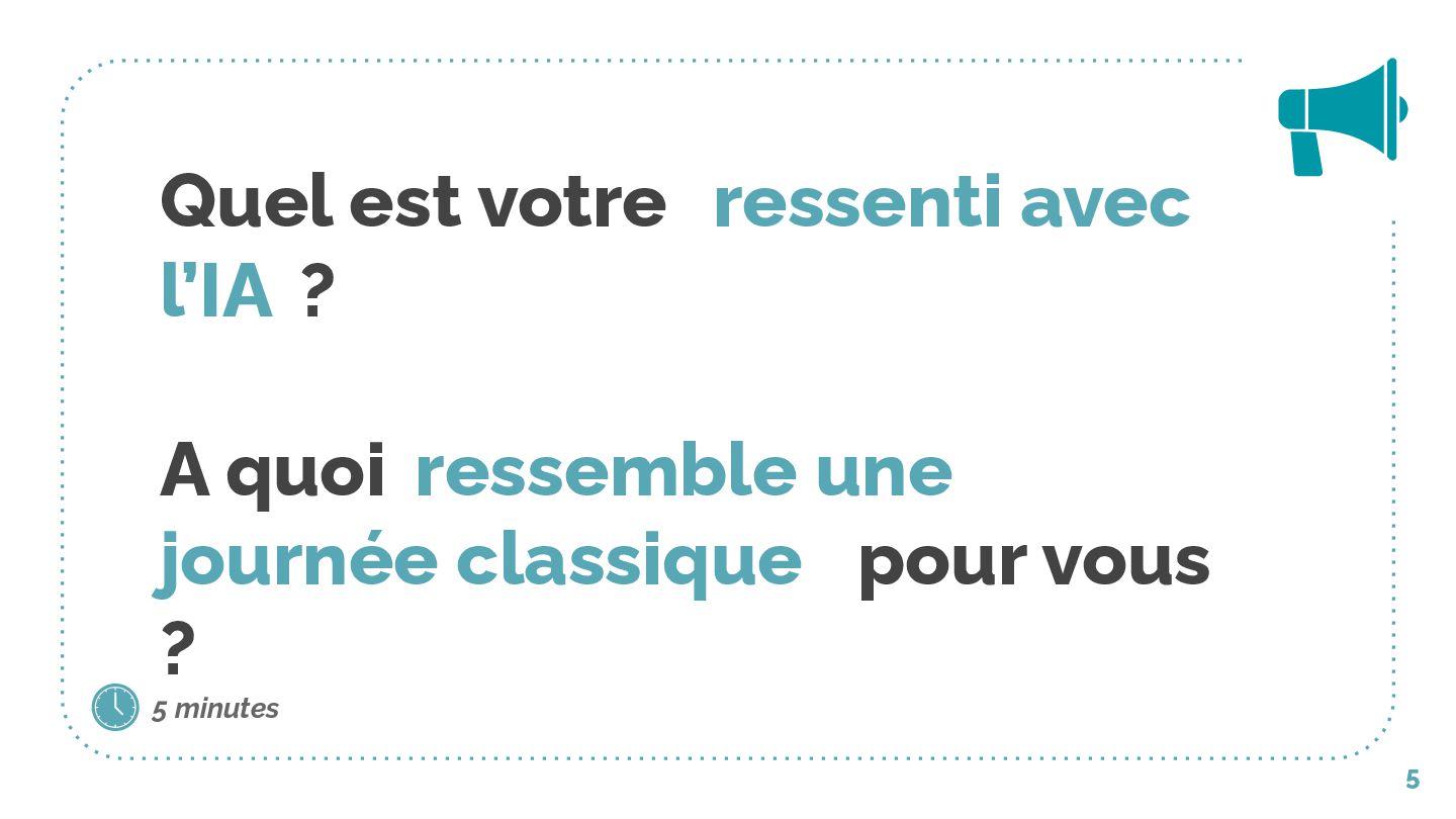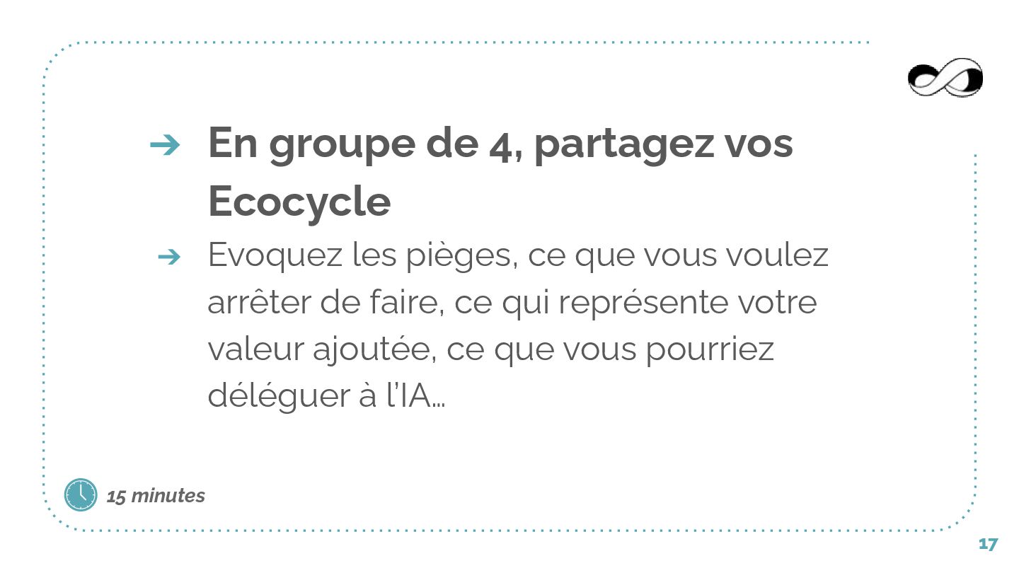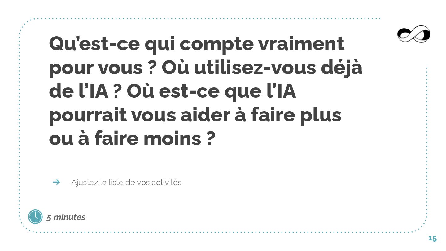 En 80 minutes, vous repartirez avec votre carte d’activités personnelles que vous souhaitez confier à l’IA et celles qui représentent votre valeur ajoutée humaine.