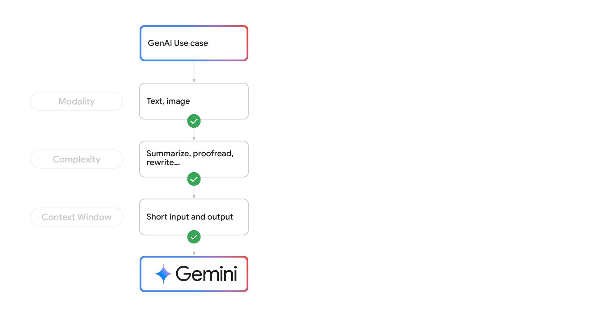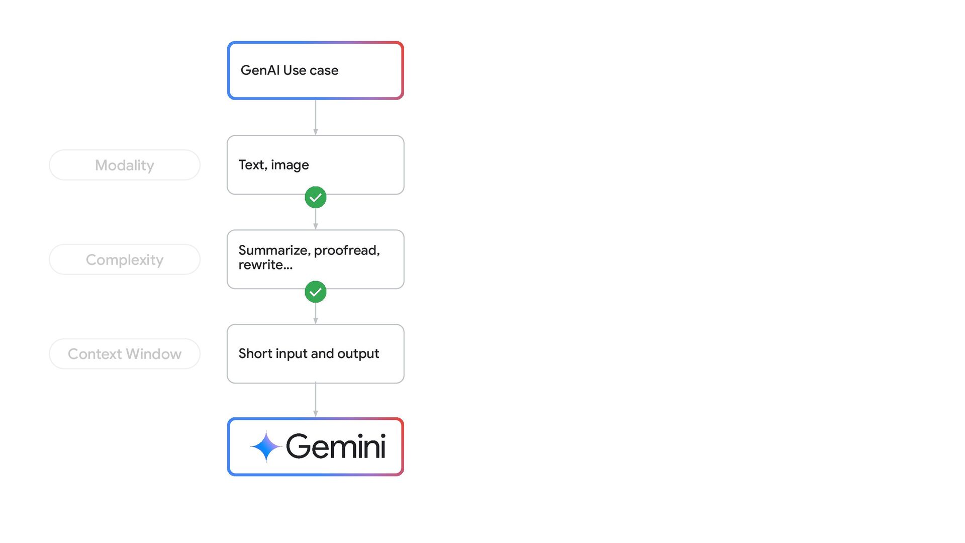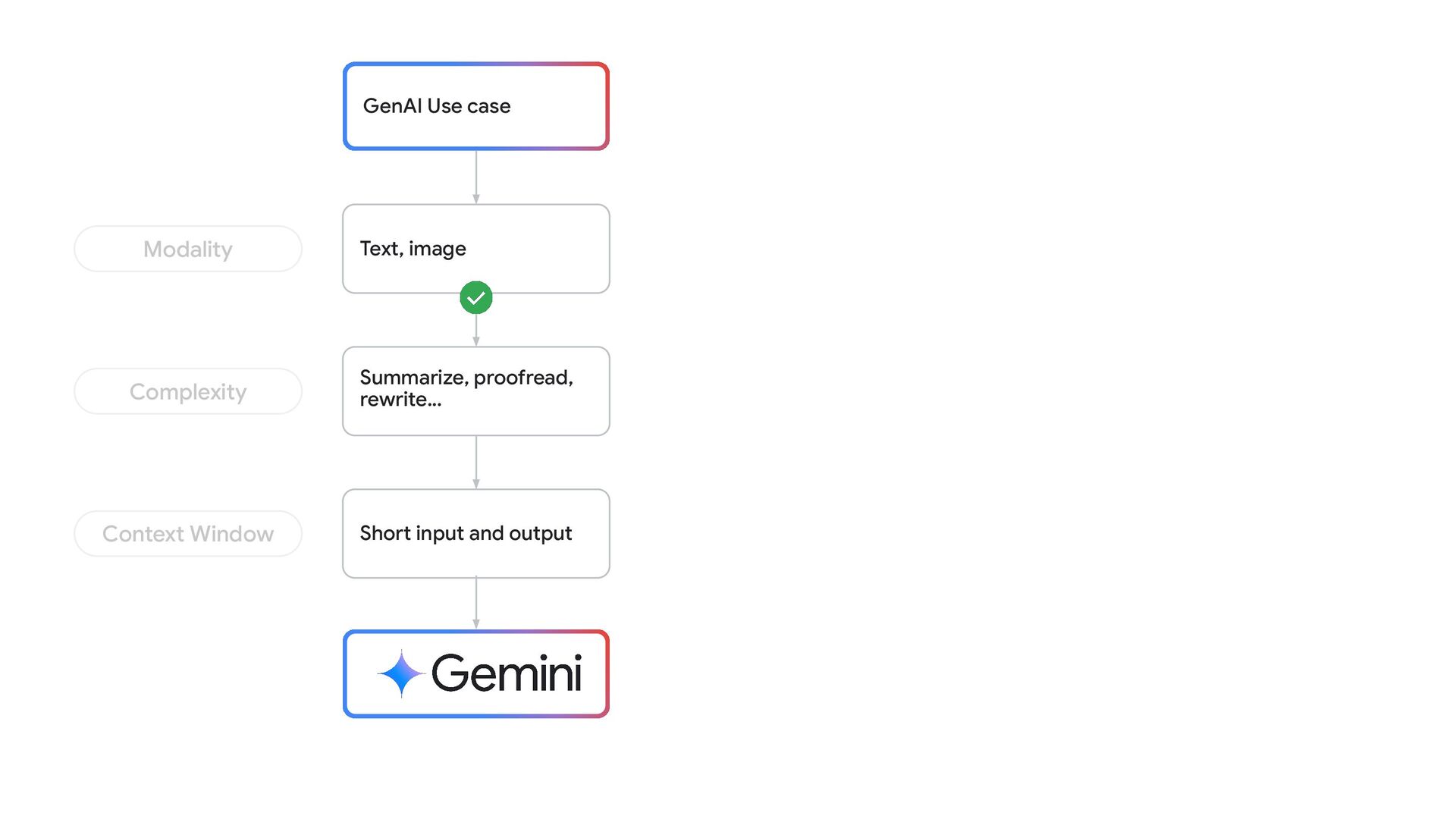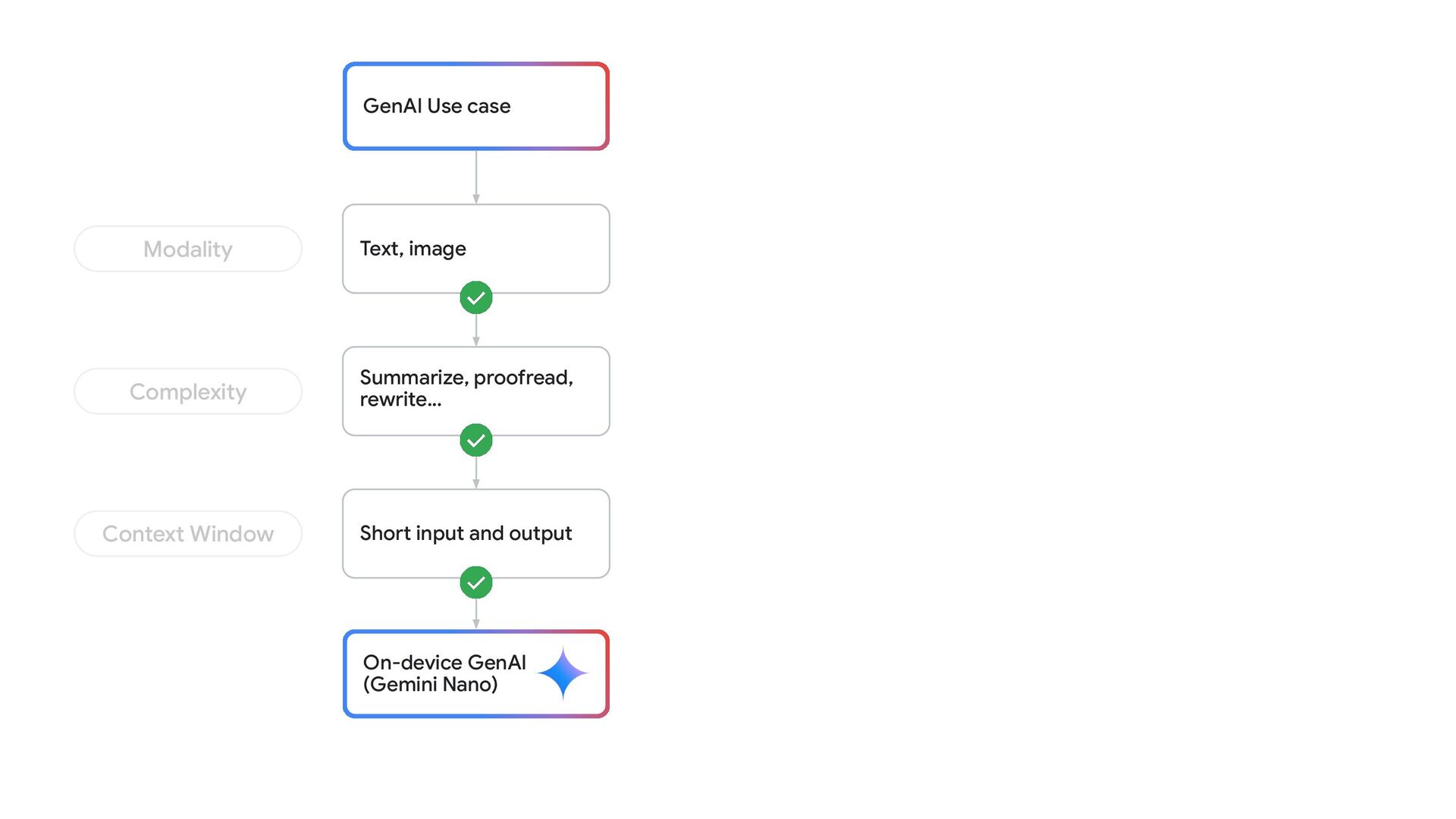 Image generation… Requires domain knowledge… Extensive documents, hours of audio/video… Audio, Video input Image generation On-device GenAI (Gemini Nano) Short input and output Summarize, proofread, rewrite… Text, image GenAI Use case Modality Complexity Context Window