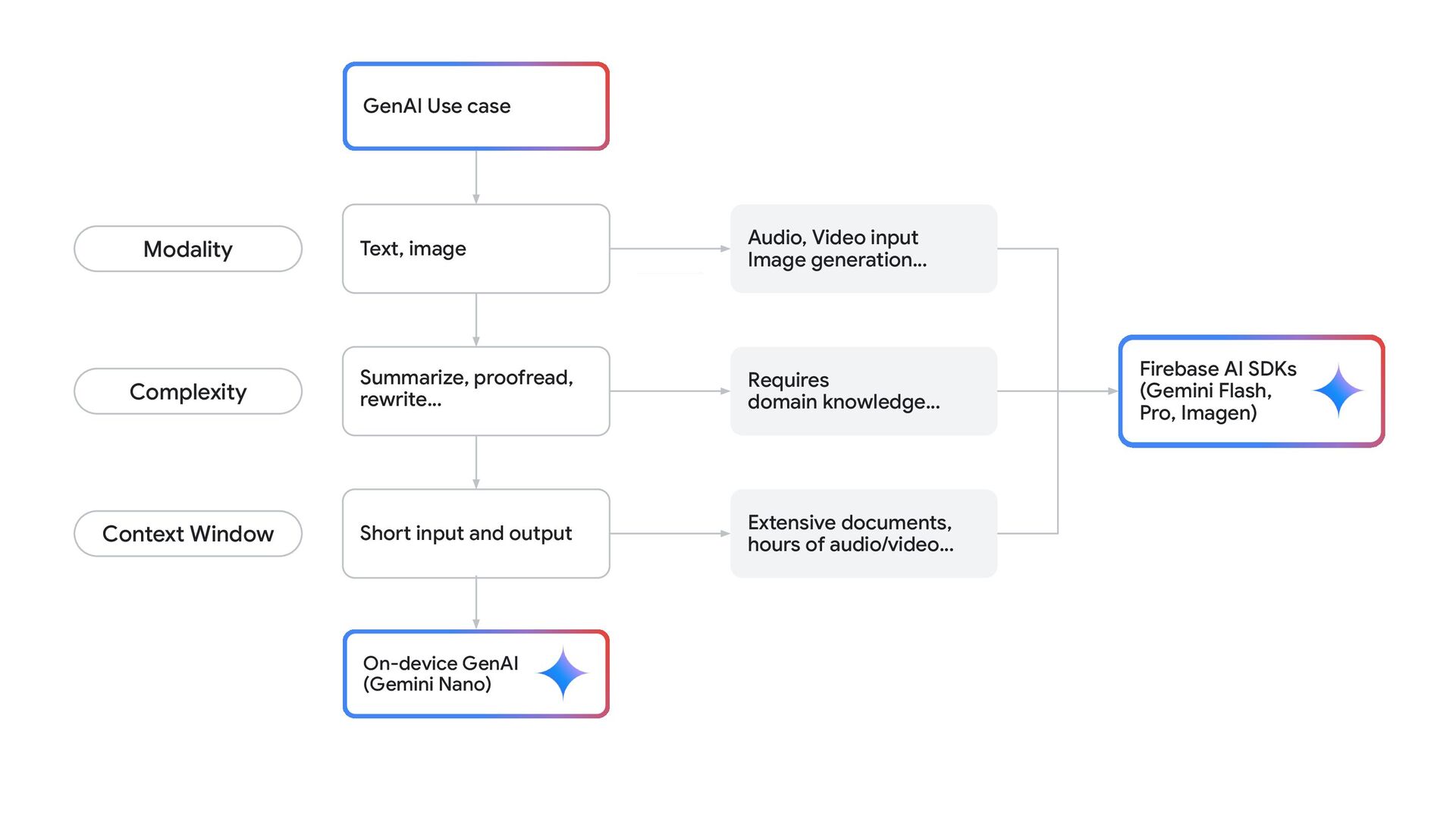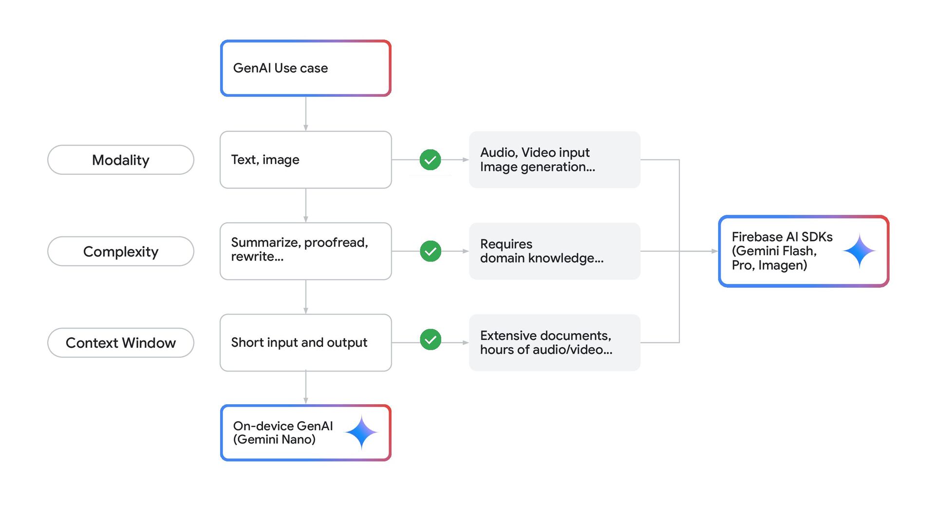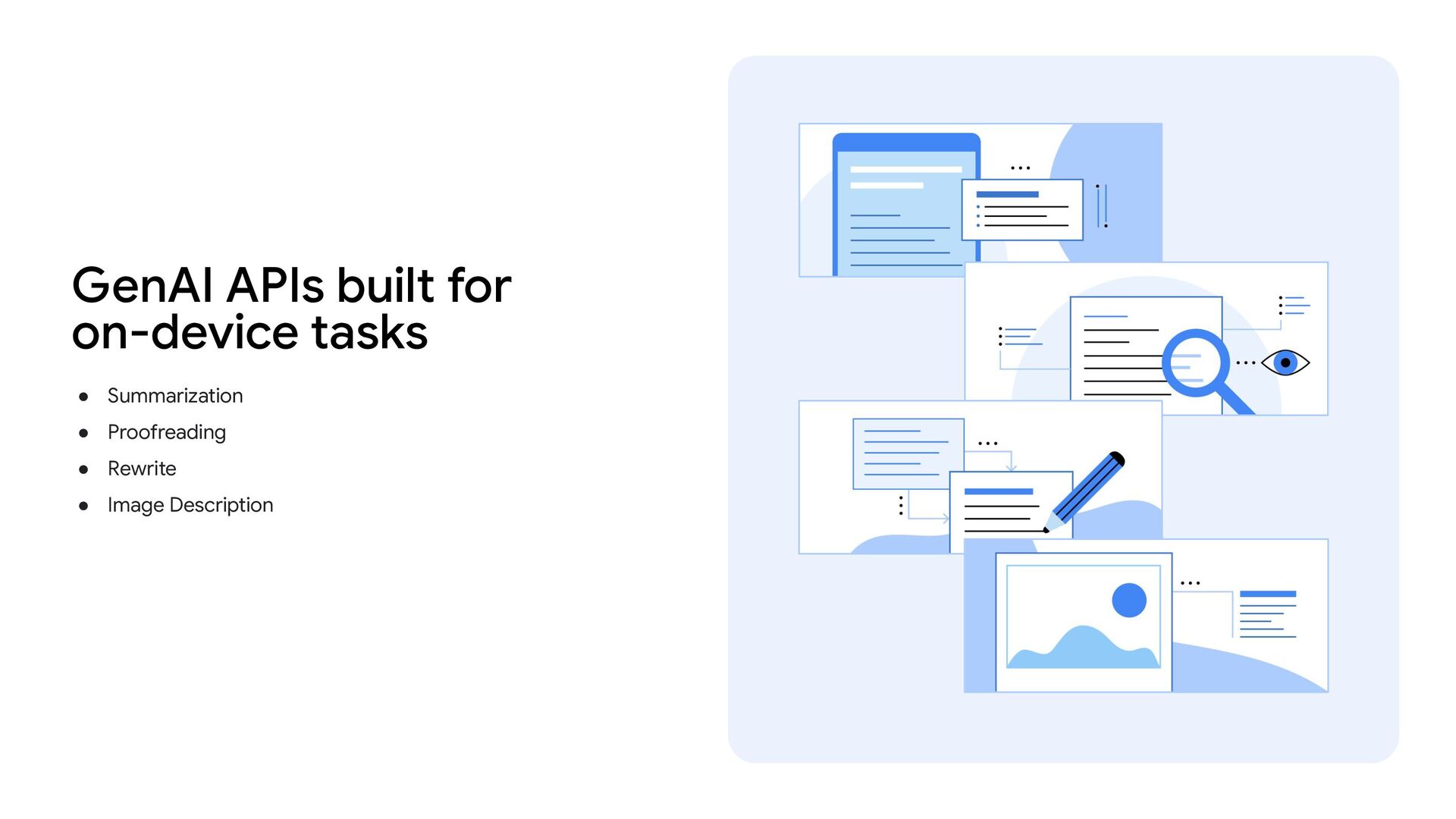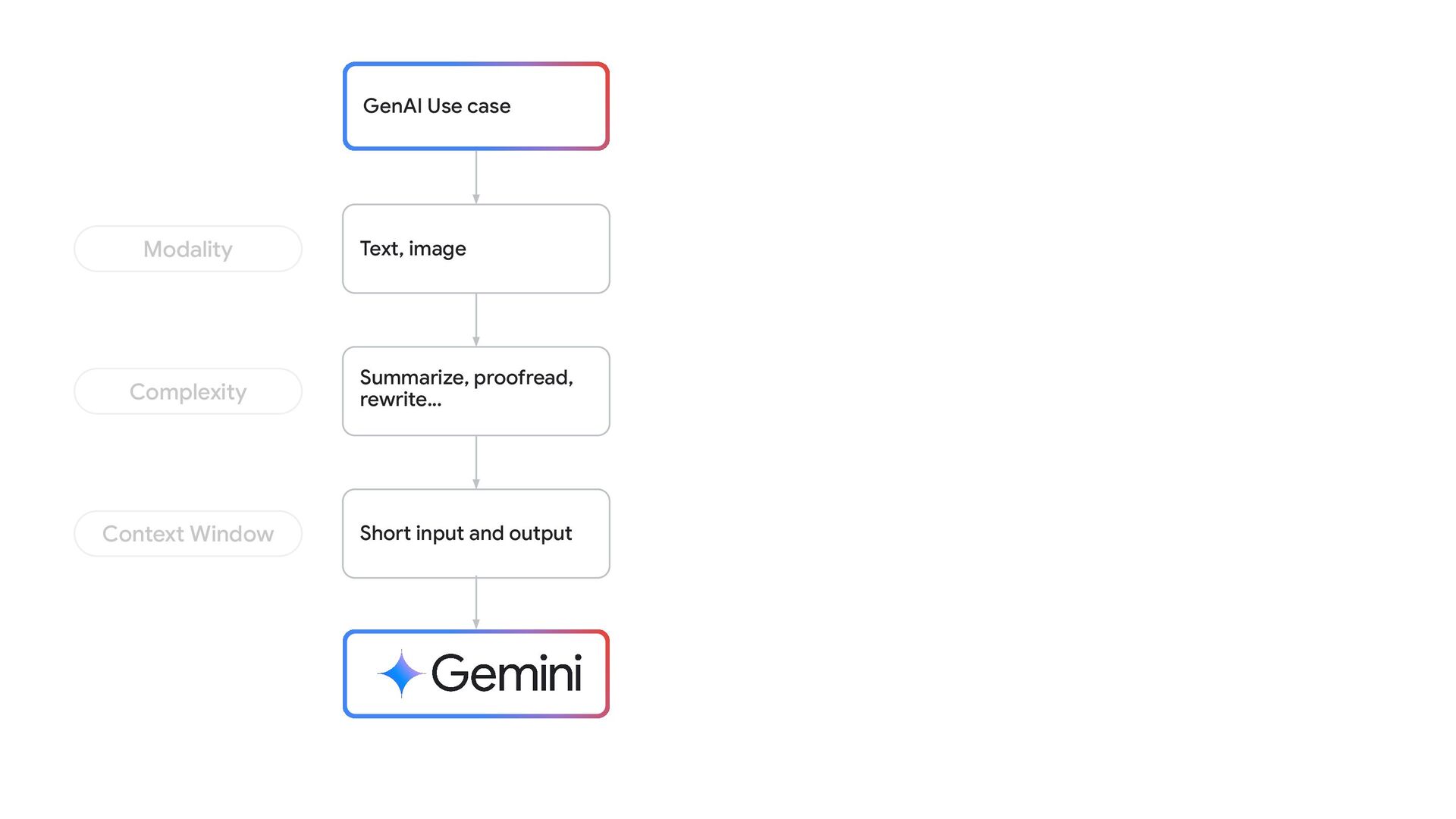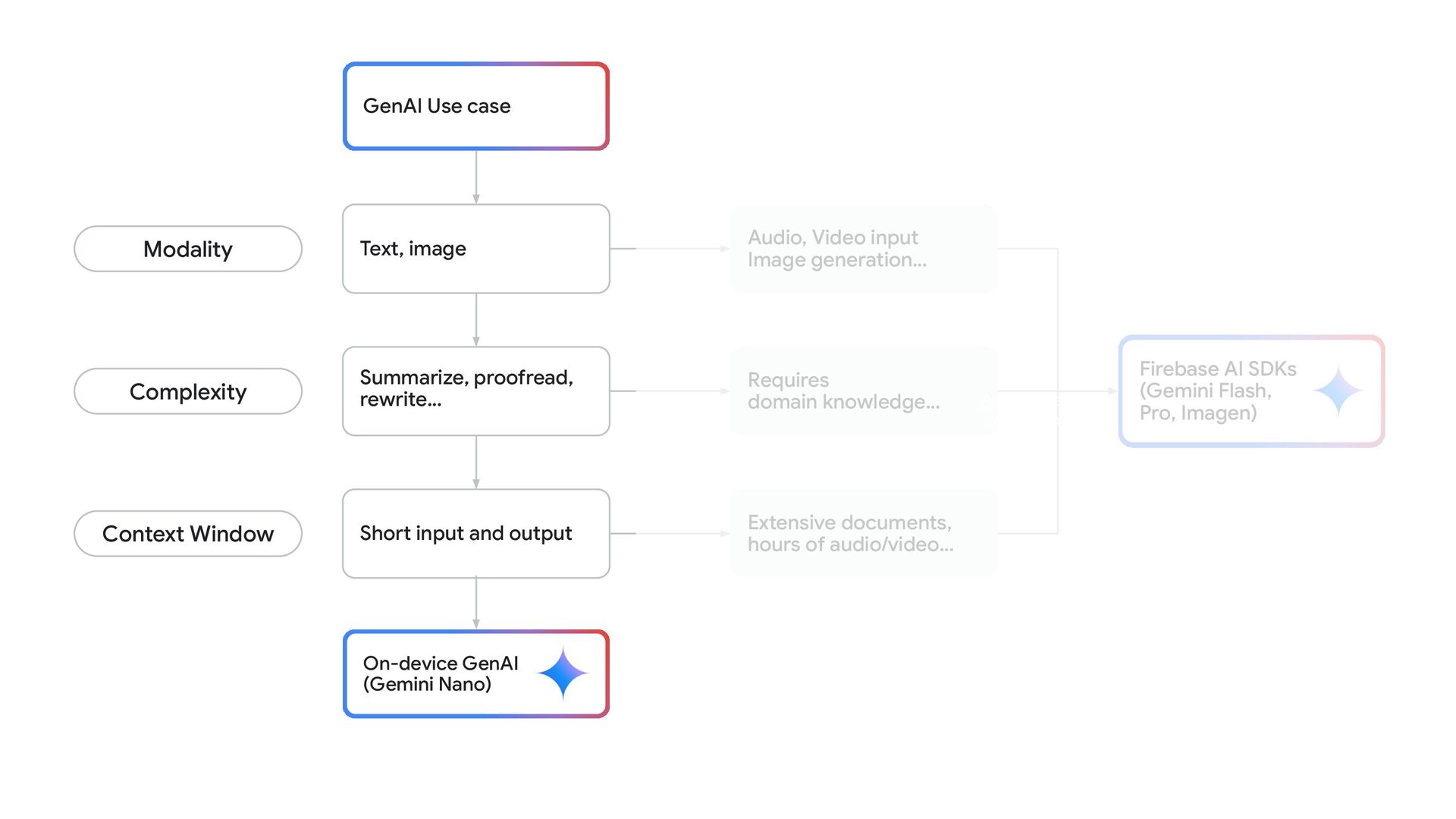 Image generation… Requires domain knowledge… Extensive documents, hours of audio/video… Audio, Video input Image generation On-device GenAI (Gemini Nano) Short input and output Summarize, proofread, rewrite… Text, image GenAI Use case Modality Complexity Context Window
