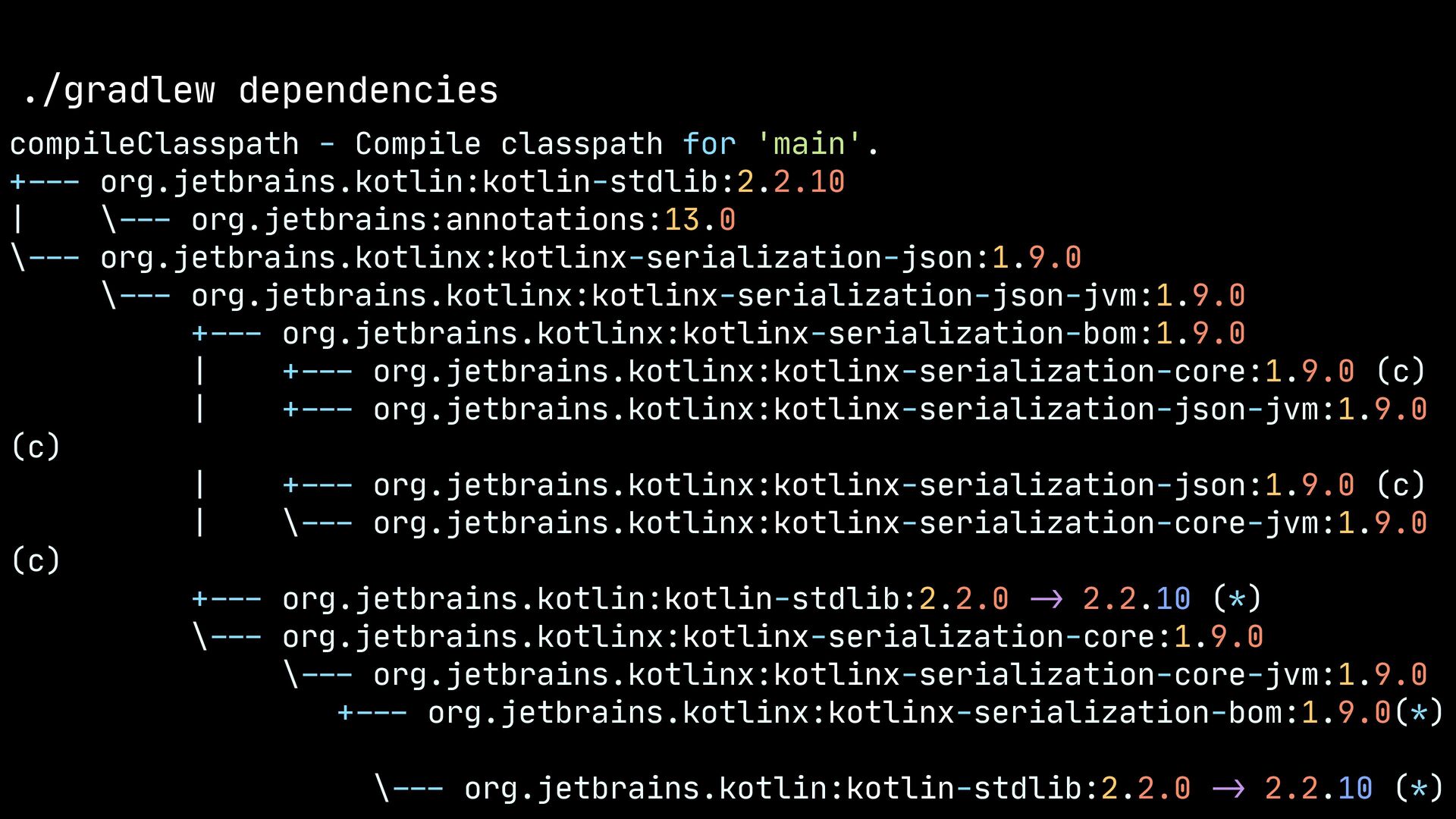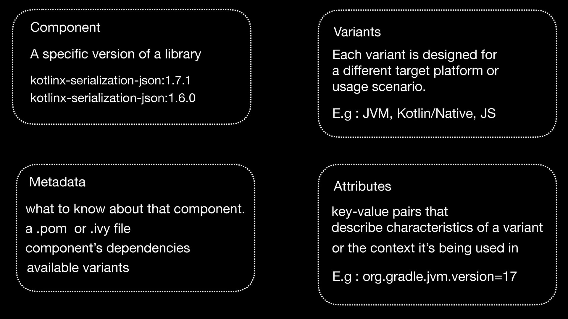 kotlinx-serialization-json:1.6.0 Metadata what to know about that component. a .pom or .ivy fi le component’s dependencies available variants Attributes key-value pairs that describe characteristics of a variant E.g : org.gradle.jvm.version=17 Variants Each variant is designed for a di ff erent target platform or usage scenario. E.g : JVM, Kotlin/Native, JS or the context it’s being used in