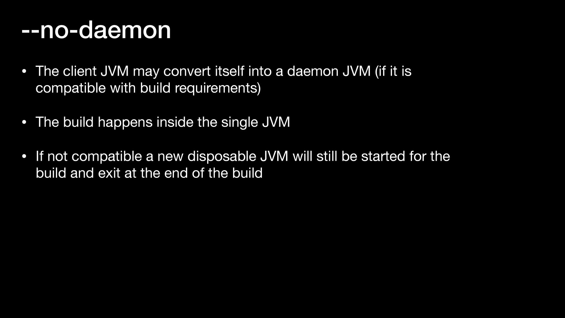 daemon JVM (if it is compatible with build requirements) • The build happens inside the single JVM • If not compatible a new disposable JVM will still be started for the build and exit at the end of the build