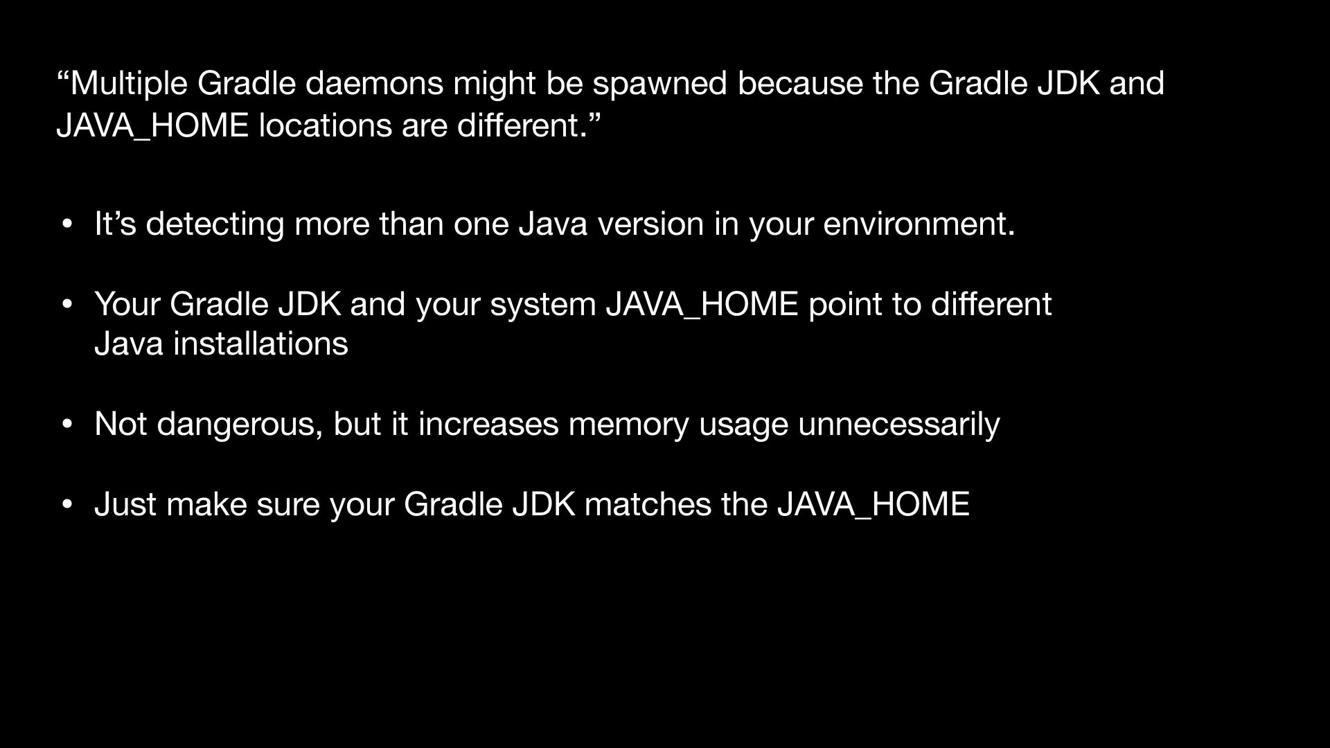 environment. • Your Gradle JDK and your system JAVA_HOME point to di ff erent Java installations • Not dangerous, but it increases memory usage unnecessarily • Just make sure your Gradle JDK matches the JAVA_HOME “Multiple Gradle daemons might be spawned because the Gradle JDK and JAVA_HOME locations are di ff erent.”
