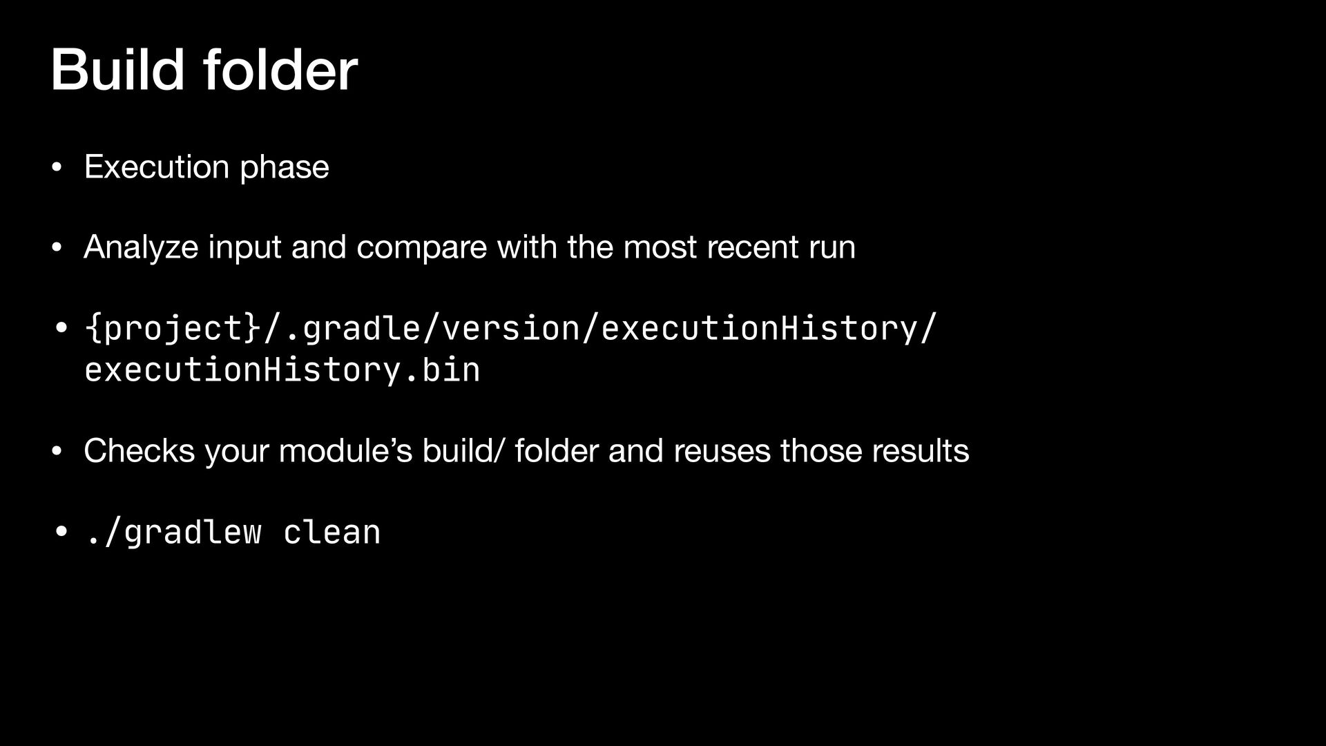with the most recent run • {project}/.gradle/version/executionHistory/ executionHistory.bin • Checks your module’s build/ folder and reuses those results • ./gradlew clean