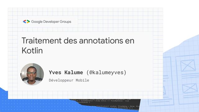 Traitement des annotations en Kotlin Yves Kalume (@kalumeyves) Développeur Mobile