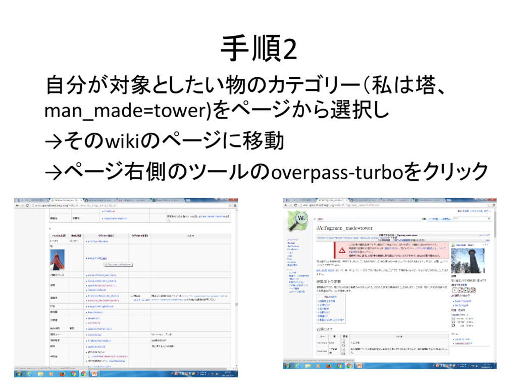 手順2 自分が対象としたい物のカテゴリー(私は塔、 man_made=tower)をページから選択し →そのwikiのページに移動 →ページ右側のツールのoverpass-turboをクリック