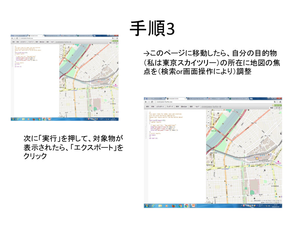 手順3 →このページに移動したら、自分の目的物 (私は東京スカイツリー)の所在に地図の焦 点を(検索or画面操作により)調整 次に「実行」を押して、対象物が 表示されたら、「エクスポート」を クリック