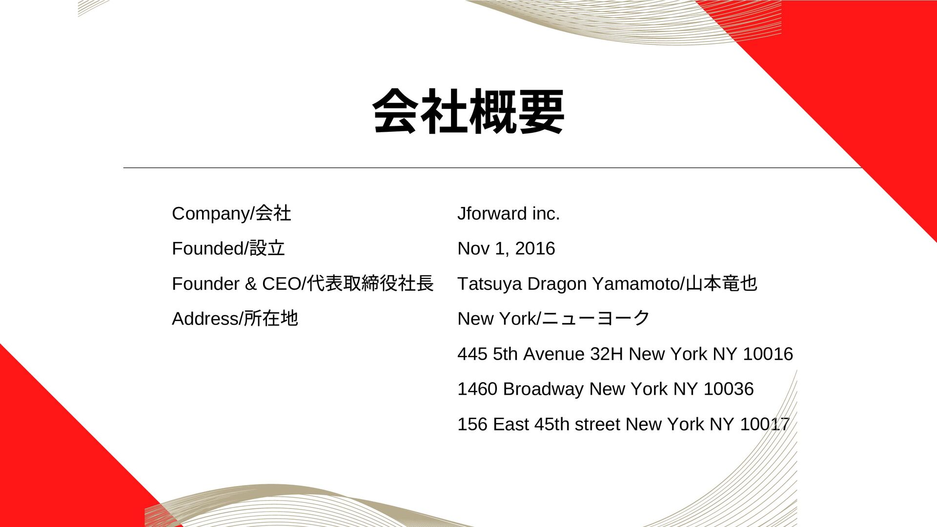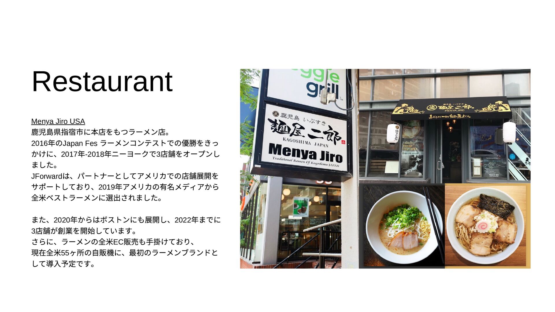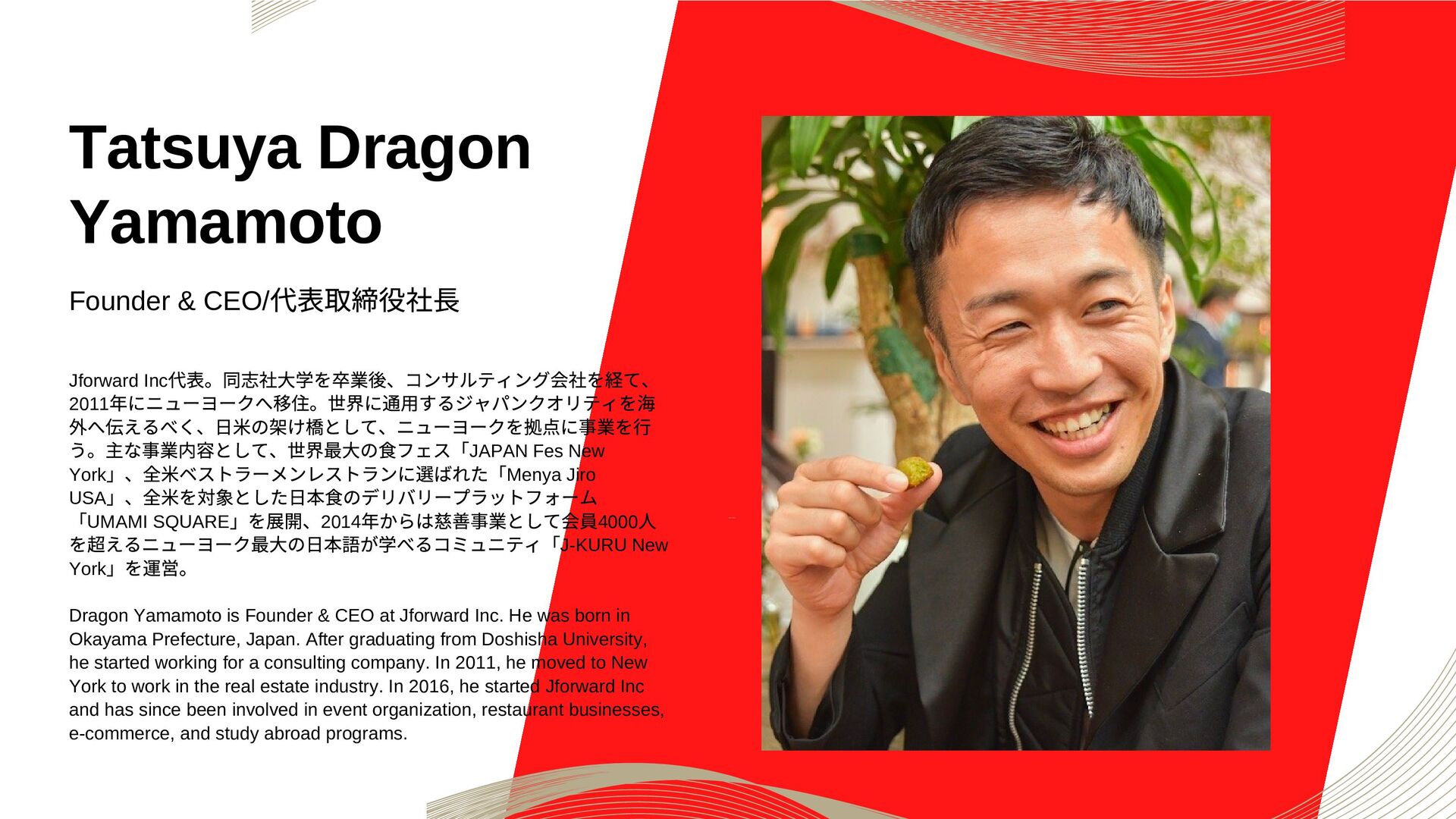 Jforward Inc 代表。同志社大学を卒業後、コンサルティング会社を経て、 2011 年にニューヨークへ移住。世界に通用するジャパンクオリティを海 外へ伝えるべく、日米の架け橋として、ニューヨークを拠点に事業を行 う。主な事業内容として、世界最大の食フェス「JAPAN Fes New York 」、全米ベストラーメンレストランに選ばれた「Menya Jiro USA 」、全米を対象とした日本食のデリバリープラットフォーム 「UMAMI SQUARE 」を展開、2014 年からは慈善事業として会員4000 人 を超えるニューヨーク最大の日本語が学べるコミュニティ「J-KURU New York 」を運営。 Dragon Yamamoto is Founder & CEO at Jforward Inc. He was born in Okayama Prefecture, Japan. After graduating from Doshisha University, he started working for a consulting company. In 2011, he moved to New York to work in the real estate industry. In 2016, he started Jforward Inc and has since been involved in event organization, restaurant businesses, e-commerce, and study abroad programs.