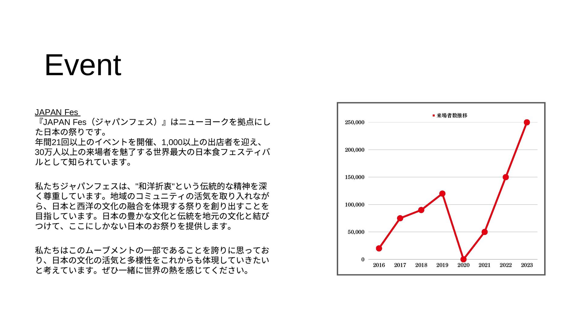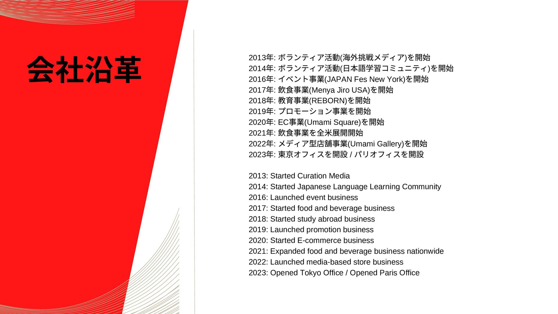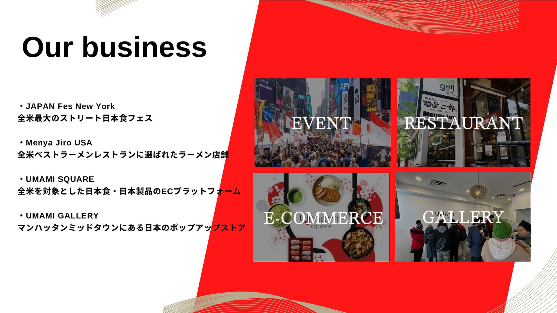Jforward Inc 代表。同志社大学を卒業後、コンサルティング会社を経て、 2011 年にニューヨークへ移住。世界に通用するジャパンクオリティを海 外へ伝えるべく、日米の架け橋として、ニューヨークを拠点に事業を行 う。主な事業内容として、世界最大の食フェス「JAPAN Fes New York 」、全米ベストラーメンレストランに選ばれた「Menya Jiro USA 」、全米を対象とした日本食のデリバリープラットフォーム 「UMAMI SQUARE 」を展開、2014 年からは慈善事業として会員4000 人 を超えるニューヨーク最大の日本語が学べるコミュニティ「J-KURU New York 」を運営。 Dragon Yamamoto is Founder & CEO at Jforward Inc. He was born in Okayama Prefecture, Japan. After graduating from Doshisha University, he started working for a consulting company. In 2011, he moved to New York to work in the real estate industry. In 2016, he started Jforward Inc and has since been involved in event organization, restaurant businesses, e-commerce, and study abroad programs.