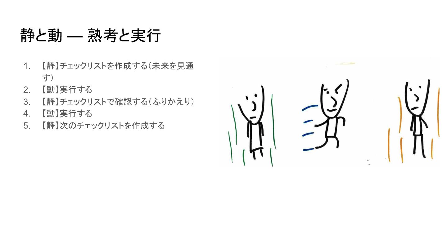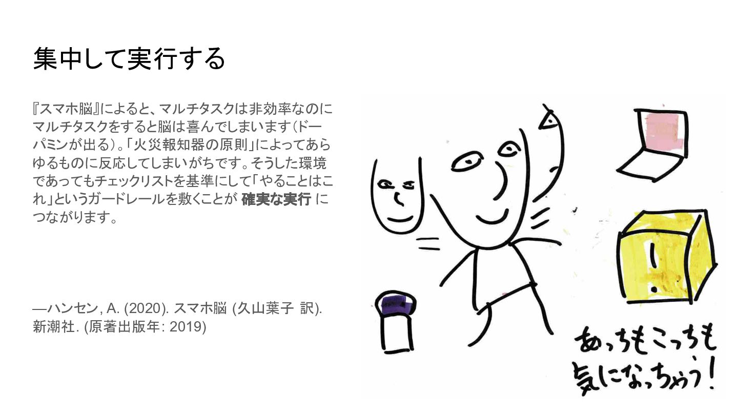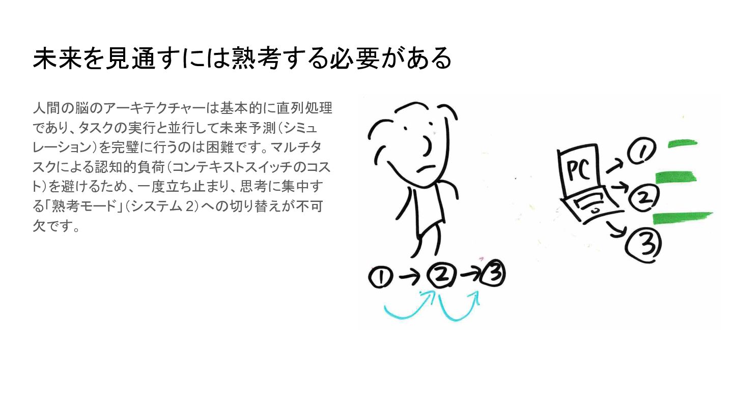 https://www.apa.org/topics/research/multit asking 2. Blades, S. (2017, Fall). The multitasking mirage: More is not always better. The Higher Education Workplace, 4–7. https://www.cupahr.org/wp-content/upload s/KC/heworkplace/Multitasking_Vol9No2.p df 人は案外動きながら考えるのが苦手 • 人間の脳のアーキテクチャーは基本的に直 列処理。並列処理は物理的にできず、タスク を切り替えている(コンテキストスイッチ) • コンテキストスイッチにはコストが伴う [1] • 複数の認知タスクを並行して行うと IQを一次 的に10〜15ポイント(睡眠不足や薬物使用 と同等レベルに)低下させることもあるらしい [2]