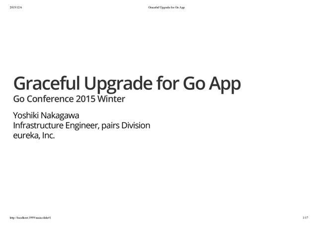 with Einhorn Package httpdown (https://github.com/facebookgo/httpdown) provides a library that makes it easy to build a HTTP server that can be shutdown gracefully (that is, without dropping any connections). grace (https://github.com/facebookgo/grace) package uses this package underneath. ▶ Need Implements facebookgo/httpdown 1. Communicates with the einhorn master from workers (e.g. send ACK). # U s e p a c k a g e g o - e i n h o r n i m p o r t g i t h u b . c o m / s t r i p e / g o - e i n h o r n 2. Be able to receive SIGUSR2 signal (from the einhorn master and then graceful shutdown). # A d d S I G U S R 2 s i g n a l s i g n a l . N o t i f y ( . . . , s y s c a l l . S I G U S R 2 )