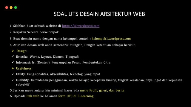 di https://id.wordpress.com 2. Kerjakan Seceara berkelompok 3. Buat domain name dengan nama kelompok contoh : kelompok1.wordpress.com 4. Atur dan desain web anda semenarik mungkin, Dengen ketentuan sebagai berikut: Ø Design: ü Estetika: Warna, Layout, Elemen, Tipografi ü Informasi: Isi (Konten), Penyampaian Pesan, Pembentukan Citra Ø Usefulness: ü Utility: Fungsionalitas, Aksesibilitas, teknologi yang tepat ü Usability: Kemudahan penggunaan, waktu belajar, kecepatan kinerja, tingkat kesalahan, daya ingat dan kepuasan subyektif 5.Berikan menu antara lain minimal harus ada menu Profil, galeri, dan berita 6. Uploads link web ke halaman form UTS di E-Learning