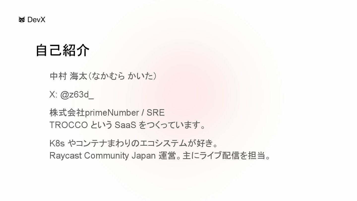 自己紹介 中村 海太(なかむら かいた) X: @z63d_ 株式会社primeNumber / SRE TROCCO