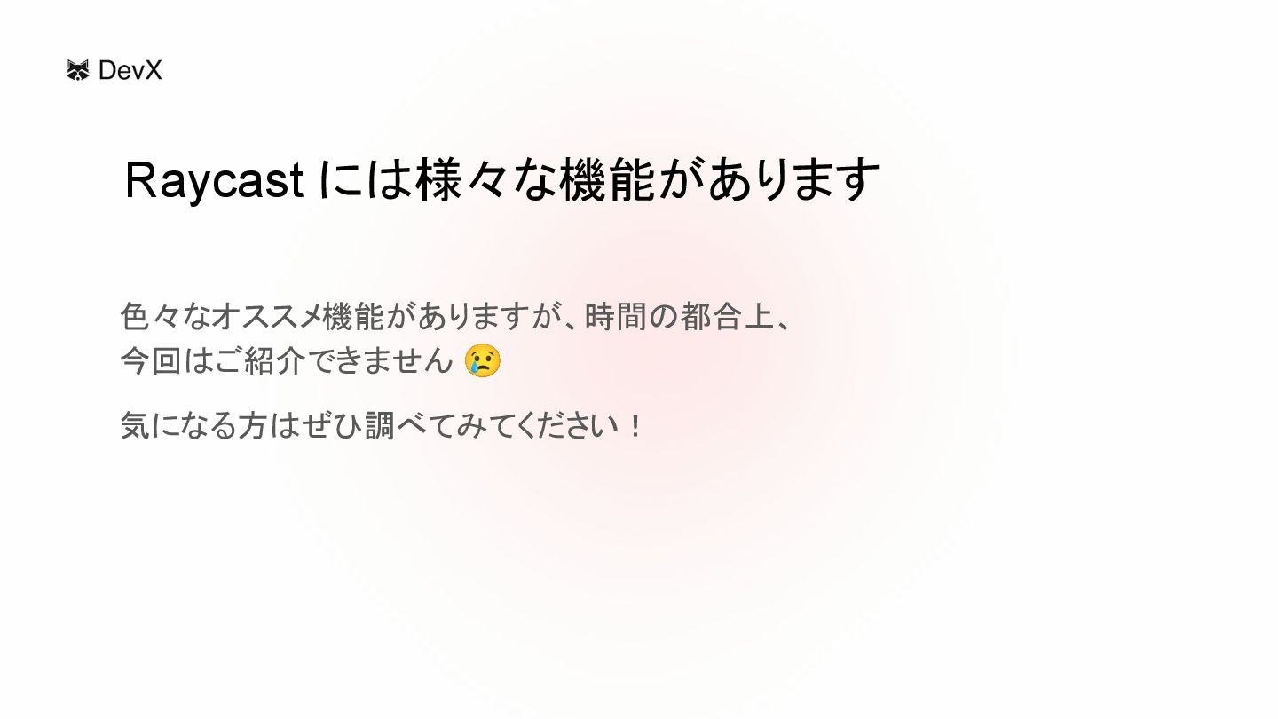 色々なオススメ機能がありますが、時間の都合上、 今回はご紹介できません 😢 気になる方はぜひ調べてみてください! Raycast には様々な機能があります