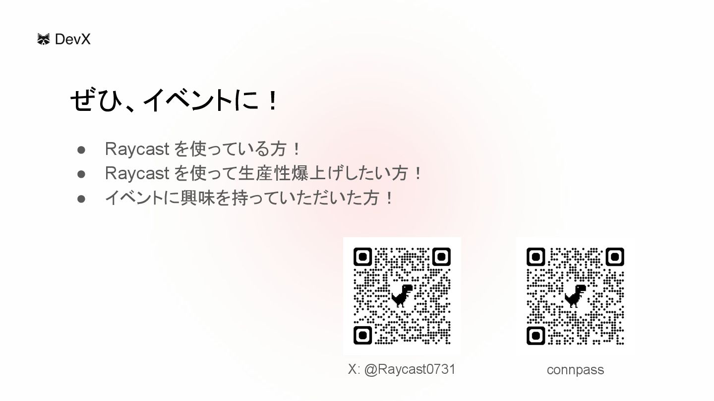 • Raycast を使っている方! • Raycast を使って生産性爆上げしたい方! • イベントに興味を持っていただいた方! X: @Raycast0731