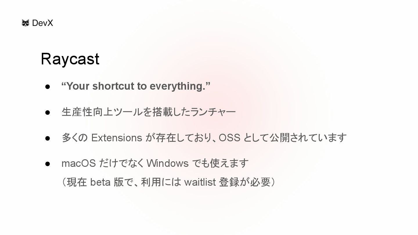 が存在しており、OSS として公開されています • macOS だけでなく Windows でも使えます (現在 beta 版で、利用には waitlist 登録が必要) Raycast