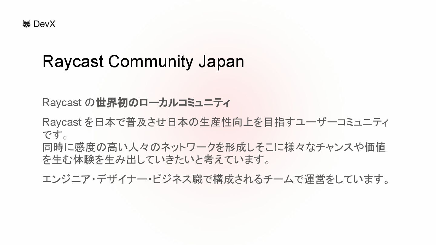 Raycast の世界初のローカルコミュニティ Raycast を日本で普及させ日本の生産性向上を目指すユーザーコミュニティ です。 同時に感度の高い人々のネットワークを形成しそこに様々なチャンスや価値 を生む体験を生み出していきたいと考えています。 エンジニア・デザイナー・ビジネス職で構成されるチームで運営をしています。 Raycast Community