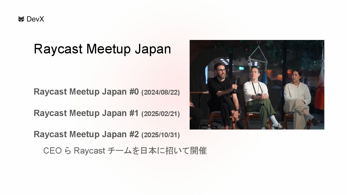 Raycast Meetup Japan #0 (2024/08/22) Raycast Meetup Japan #1 (2025/02/21)