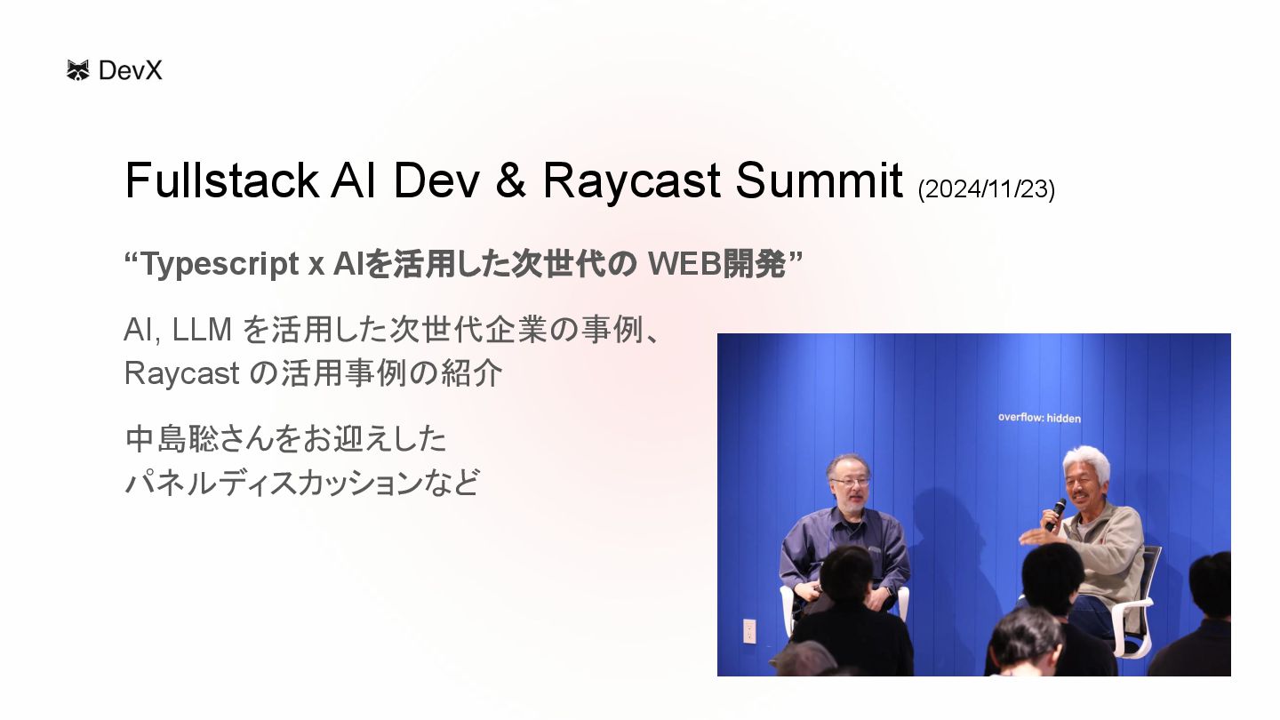 “Typescript x AIを活用した次世代の WEB開発” AI, LLM を活用した次世代企業の事例、 Raycast の活用事例の紹介 中島聡さんをお迎えした