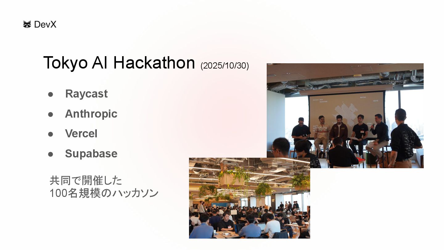 • Raycast • Anthropic • Vercel • Supabase 共同で開催した 100名規模のハッカソン