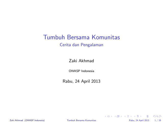 manpower as an excuse we are a volunteer project: we will always lack manpower to do something” Stefano Zacchiroli, Debian Project Leader 2010 - 2013 Zaki Akhmad (OWASP Indonesia) Tumbuh Bersama Komunitas Rabu, 24 April 2013 13 / 19