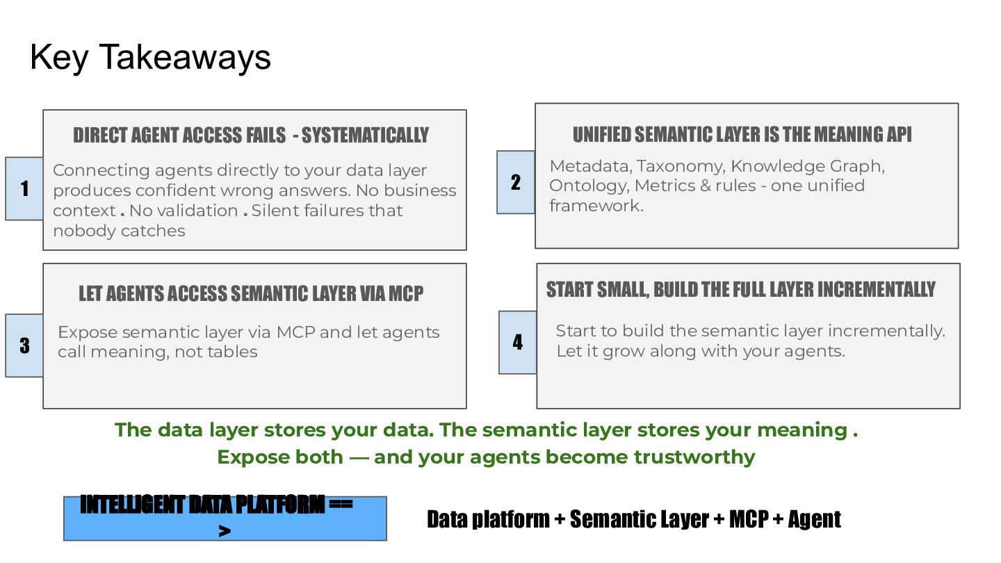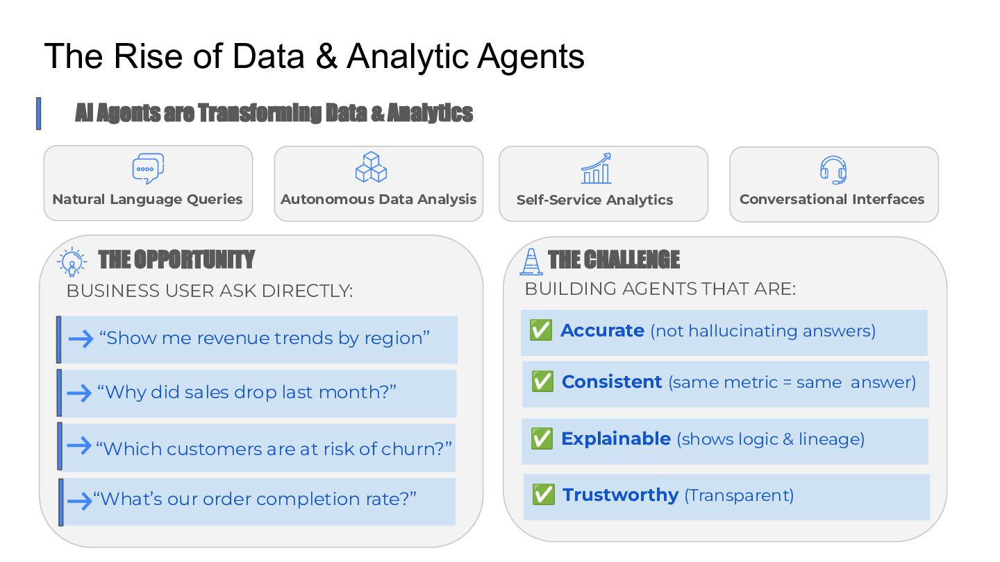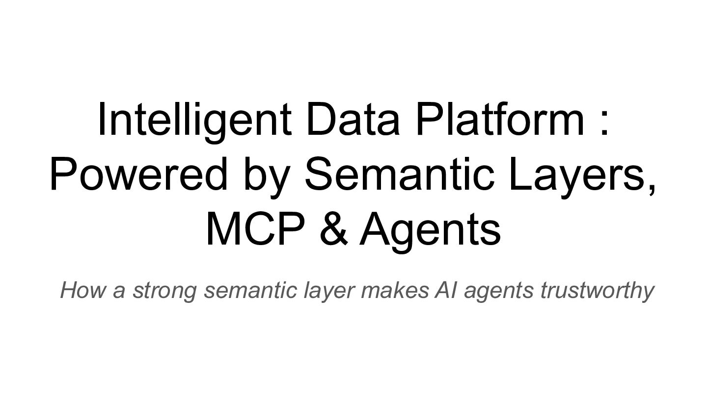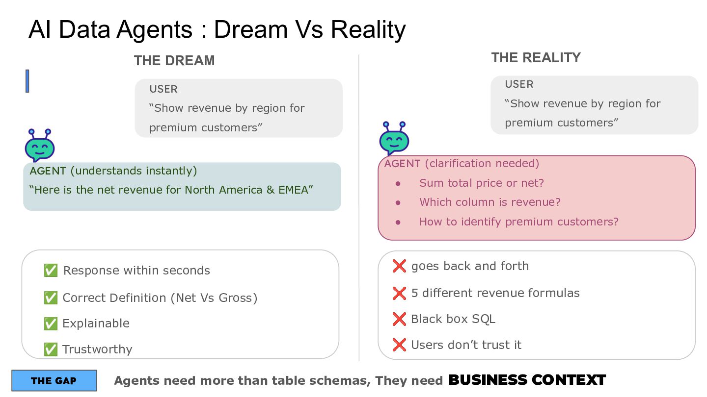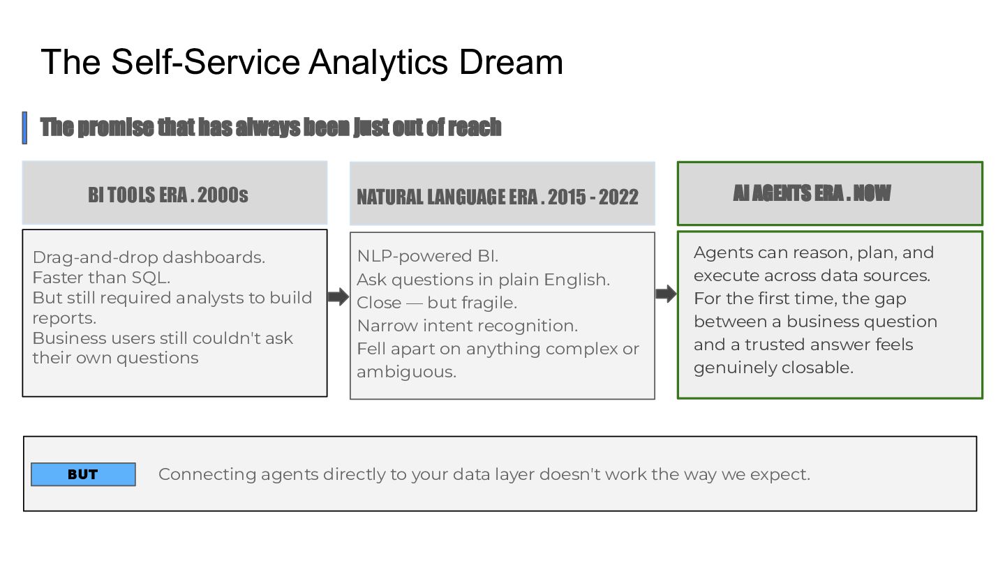Talk which discusses the self service analytics dream and the challenges when it's attempted by connecting agents directly to a data layer and introduces a unified semantic layer in between with a context assisted as well as a fully mediated pattern to make agents trustworthy . Demo to explain how a data layer only agent and a data + semantic layer agent behaves while answering business questions.