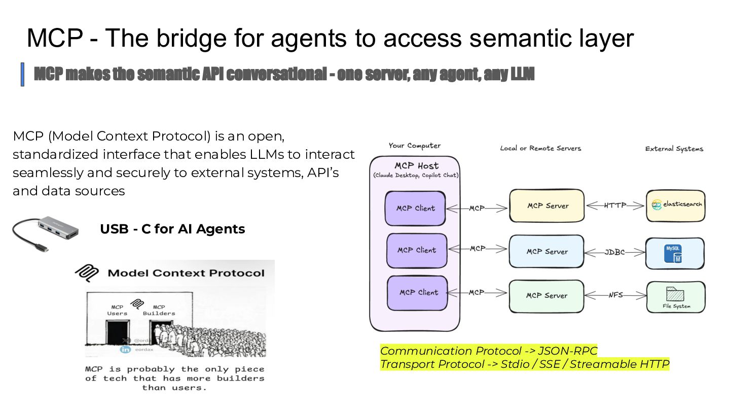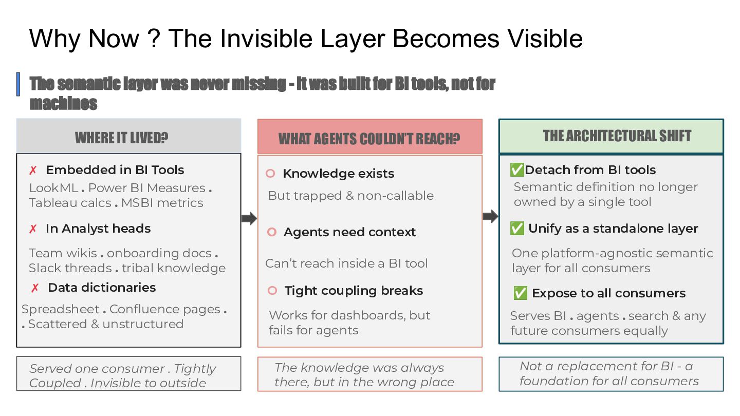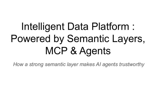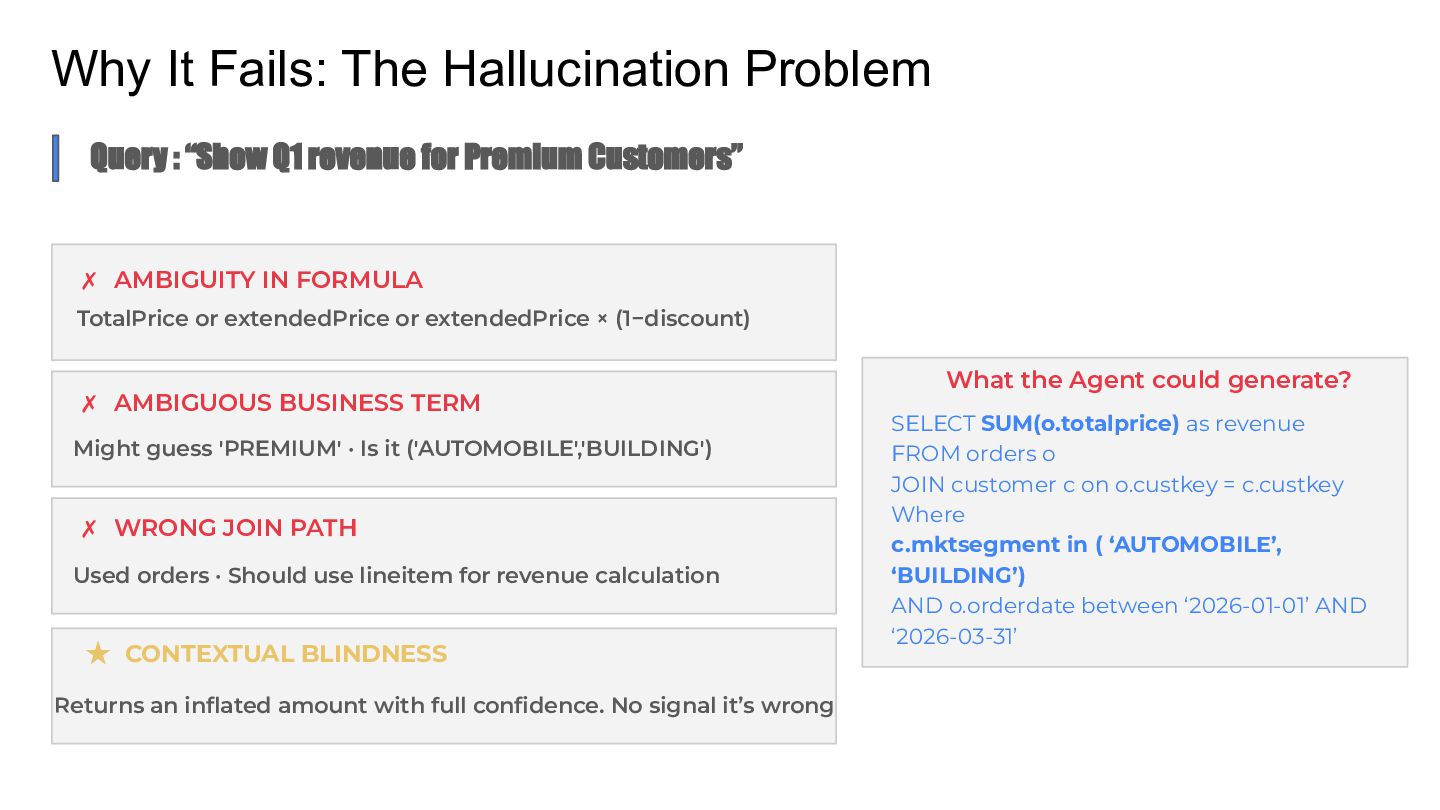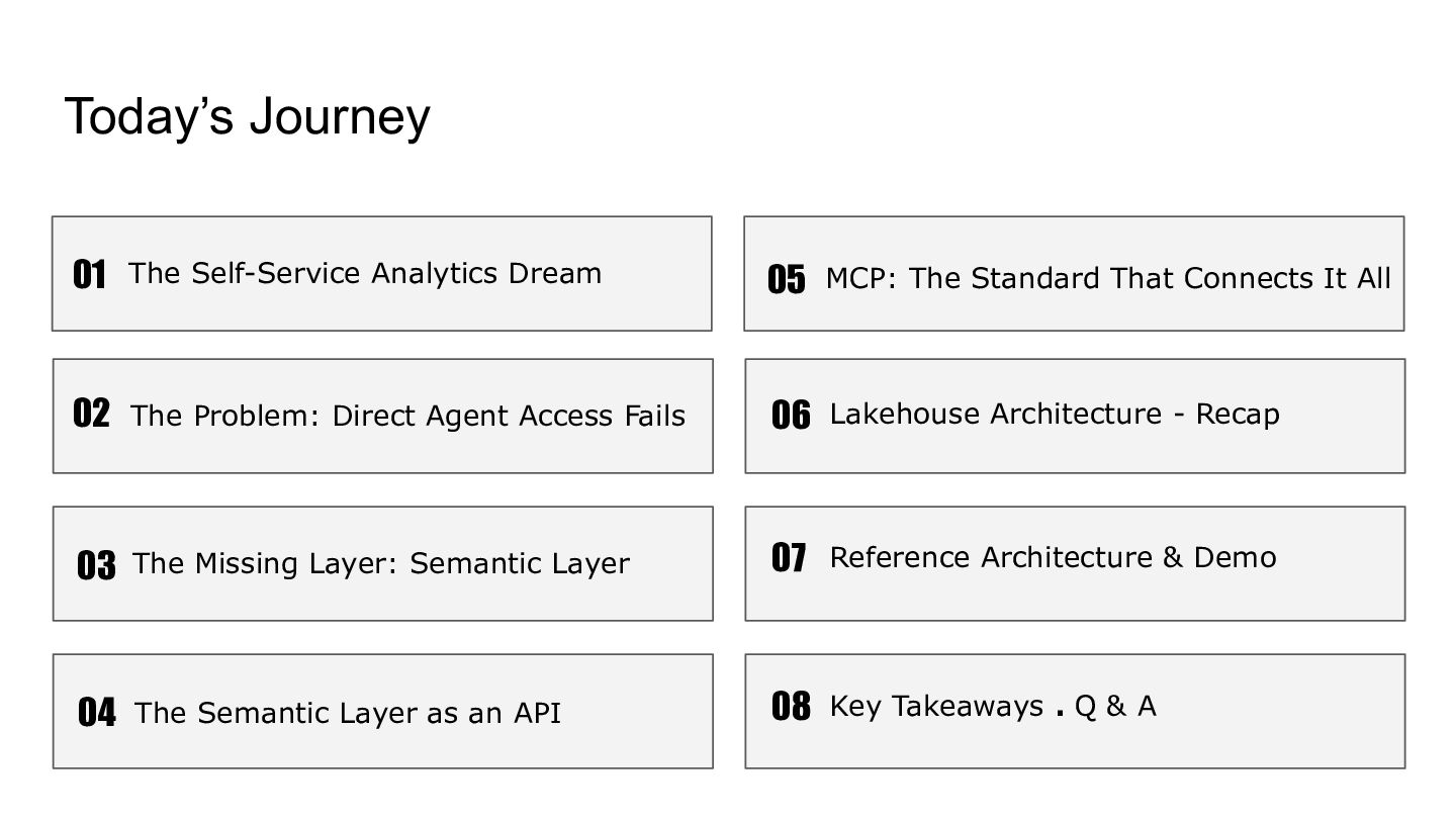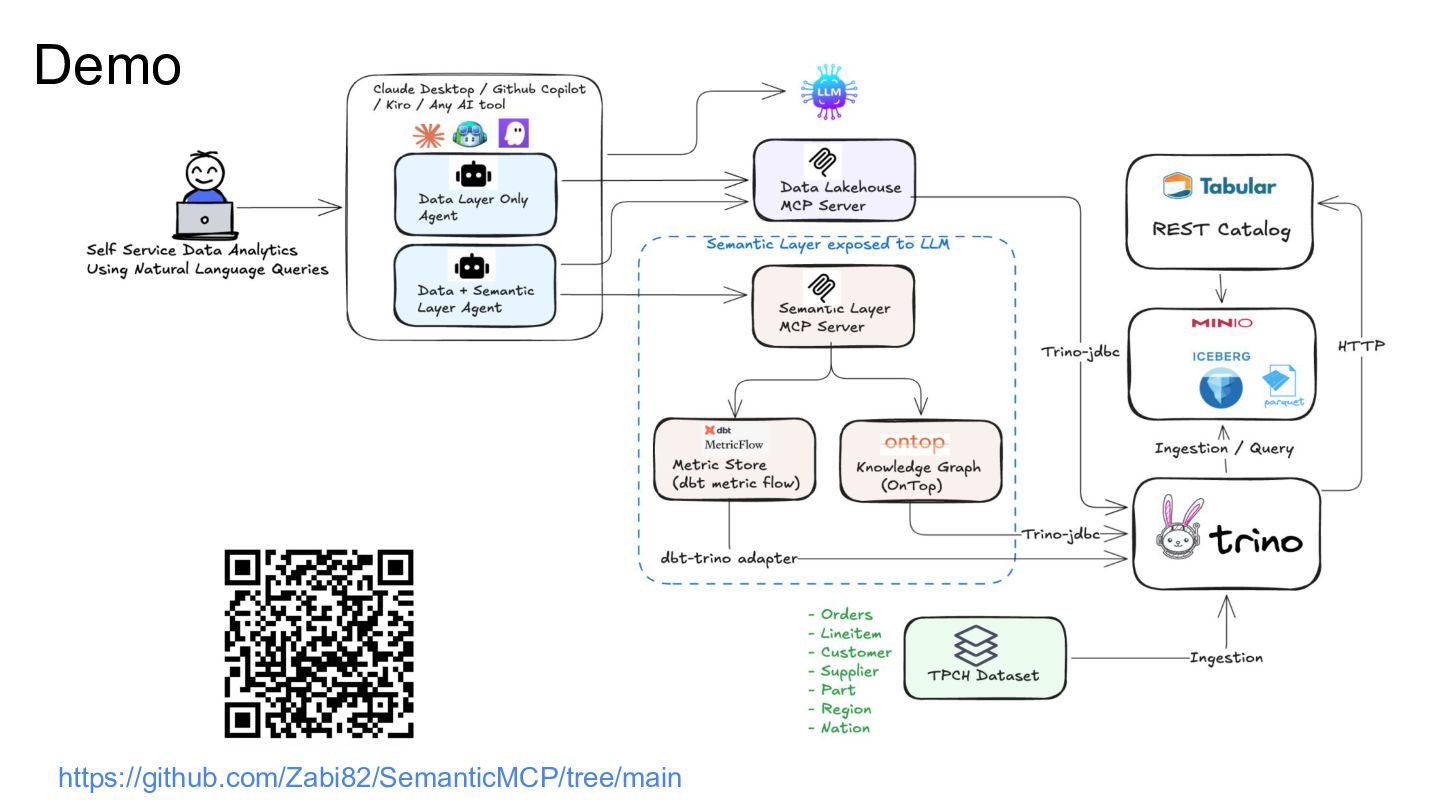 Talk which discusses the self service analytics dream and the challenges when it's attempted by connecting agents directly to a data layer and introduces a unified semantic layer in between with a context assisted as well as a fully mediated pattern to make agents trustworthy . Demo to explain how a data layer only agent and a data + semantic layer agent behaves while answering business questions.