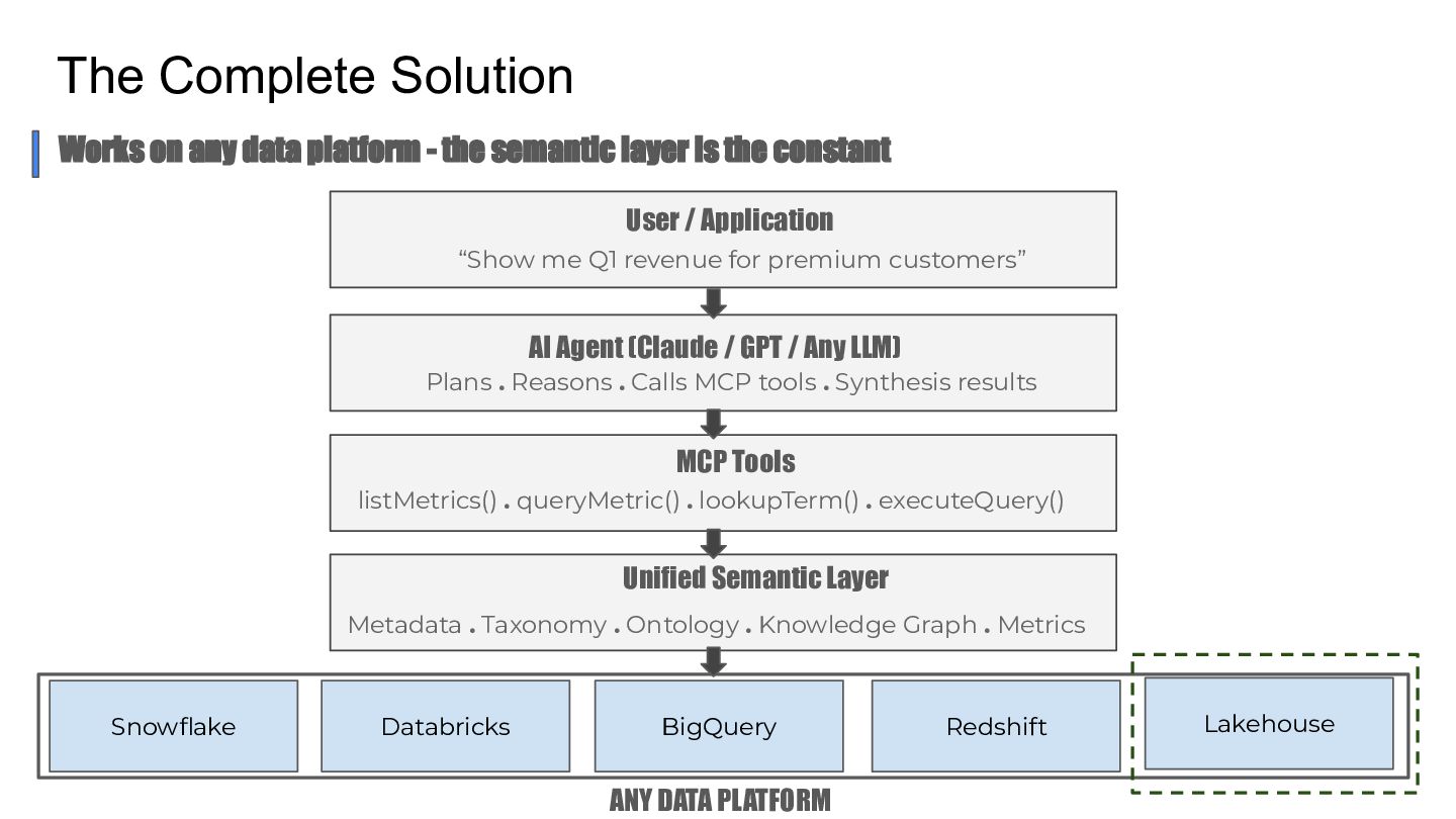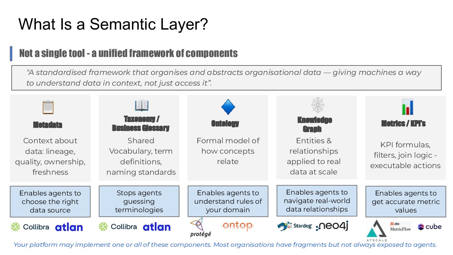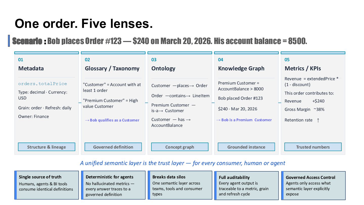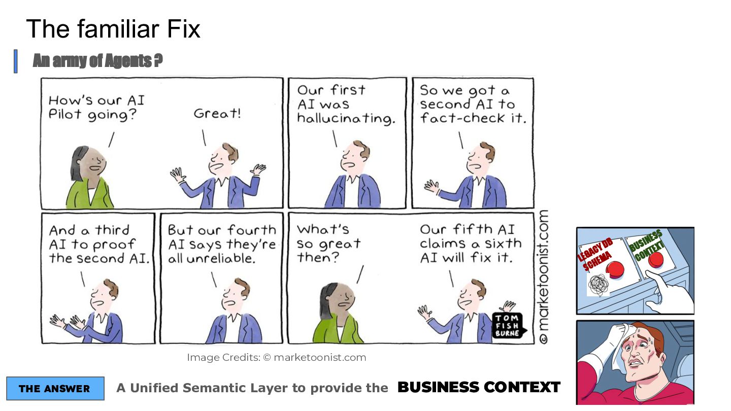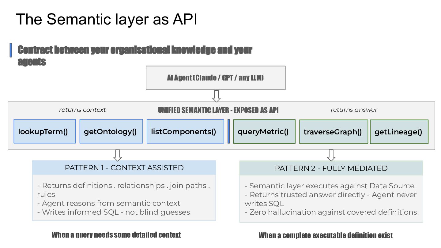 Talk which discusses the self service analytics dream and the challenges when it's attempted by connecting agents directly to a data layer and introduces a unified semantic layer in between with a context assisted as well as a fully mediated pattern to make agents trustworthy . Demo to explain how a data layer only agent and a data + semantic layer agent behaves while answering business questions.