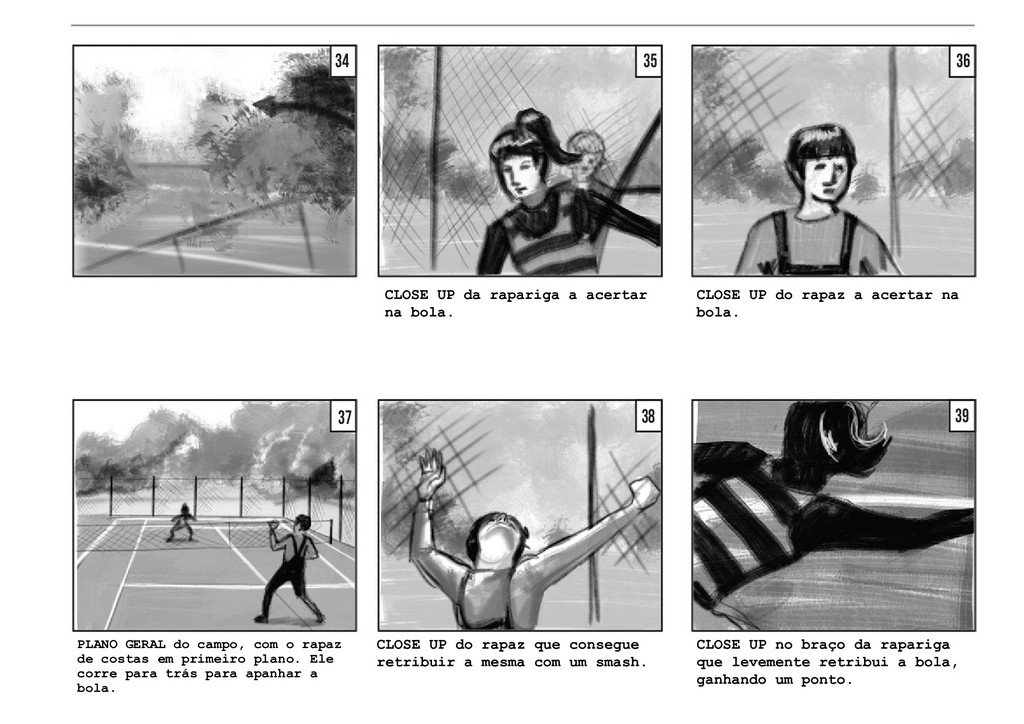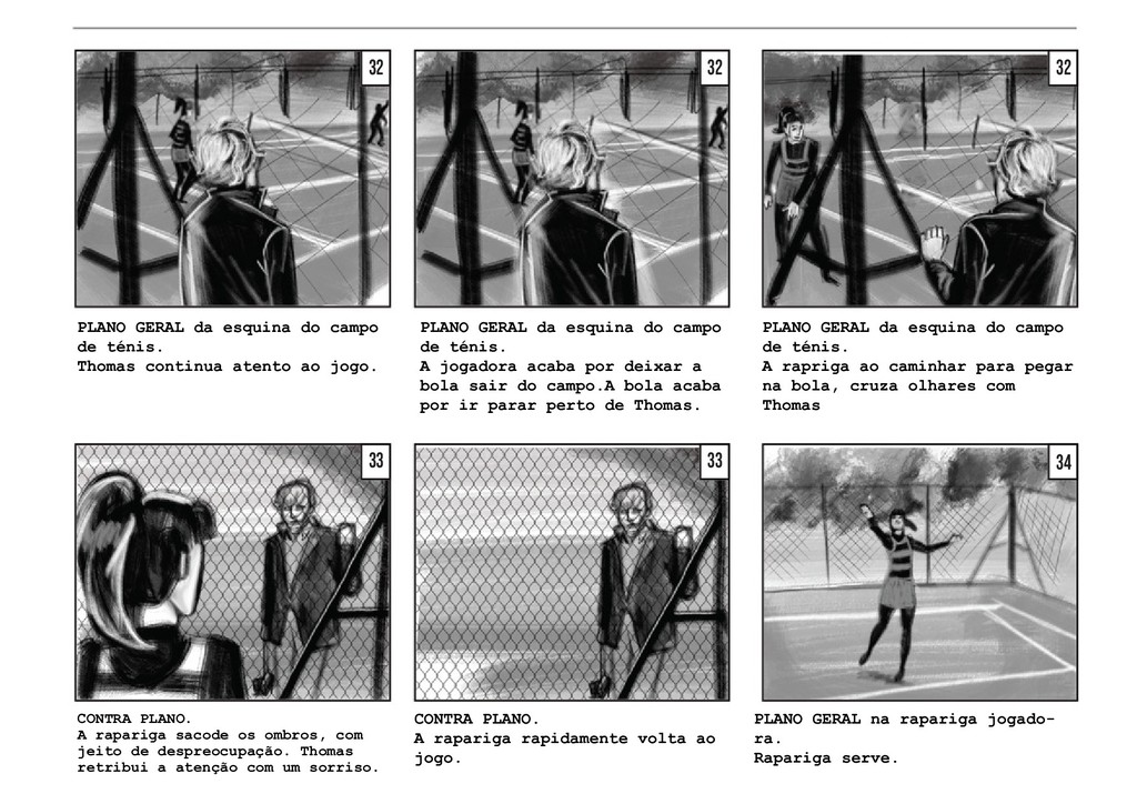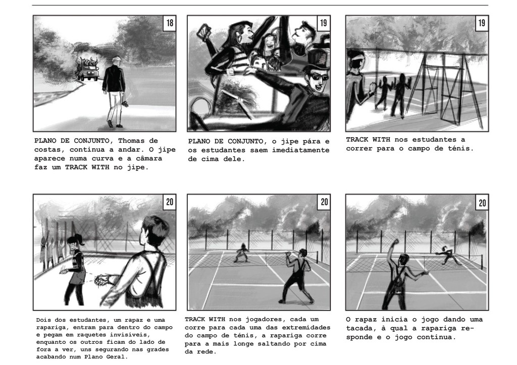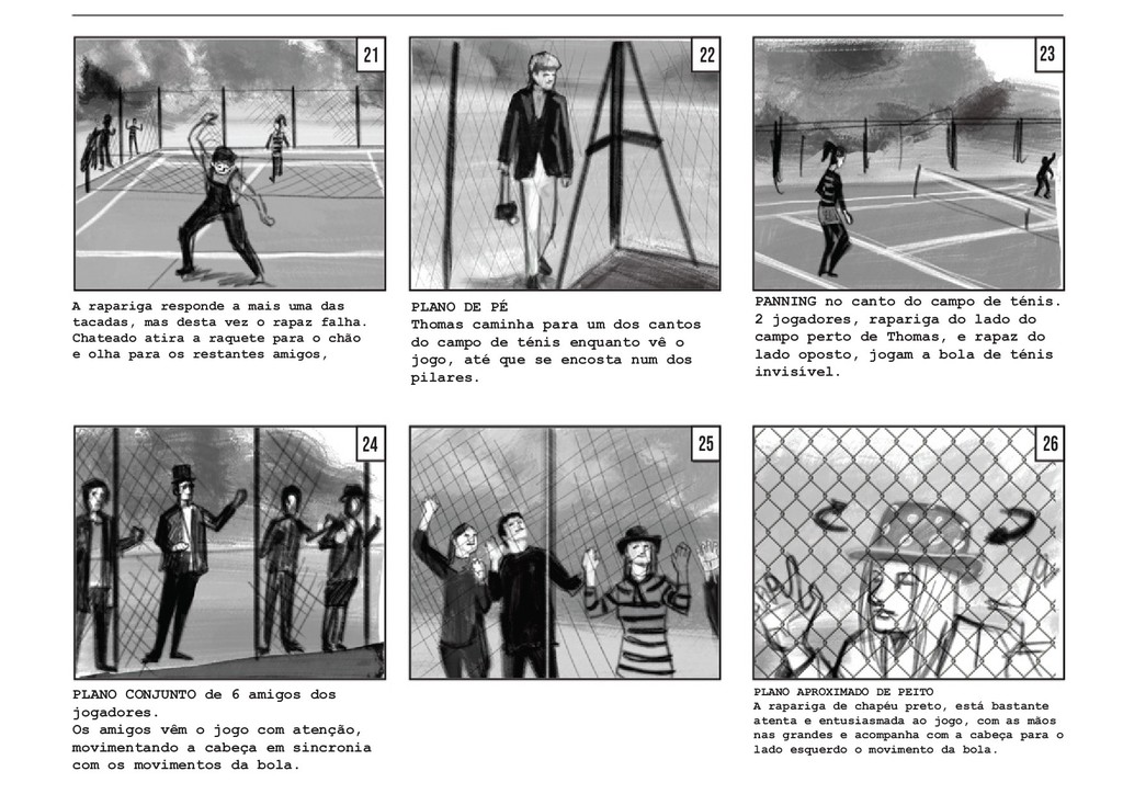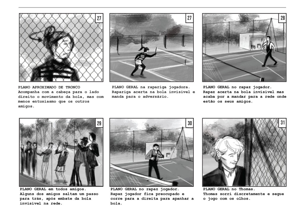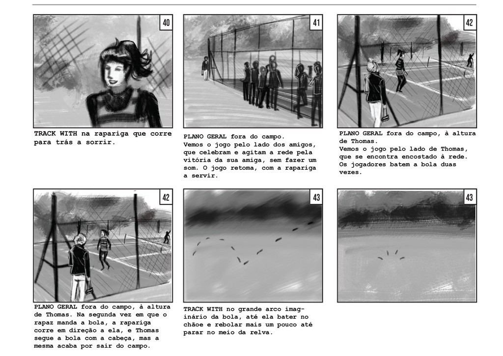 PLANO GERAL fora do campo. Vemos o jogo pelo lado dos amigos, que celebram e agitam a rede pela vitória da sua amiga, sem fazer um som. O jogo retoma, com a rapariga a servir. PLANO GERAL fora do campo, à altura de Thomas. Vemos o jogo pelo lado de Thomas, que se encontra encostado à rede. Os jogadores batem a bola duas vezes. PLANO GERAL fora do campo, à altura de Thomas. Na segunda vez em que o rapaz manda a bola, a rapariga corre em direção a ela, e Thomas segue a bola com a cabeça, mas a mesma acaba por sair do campo. TRACK WITH no grande arco imag- inário da bola, até ela bater no chãoe e rebolar mais um pouco até parar no meio da relva. 40 41 42 42 43 43