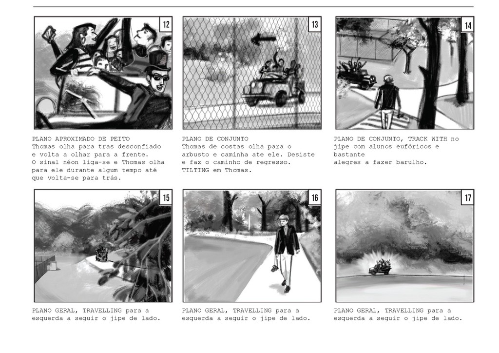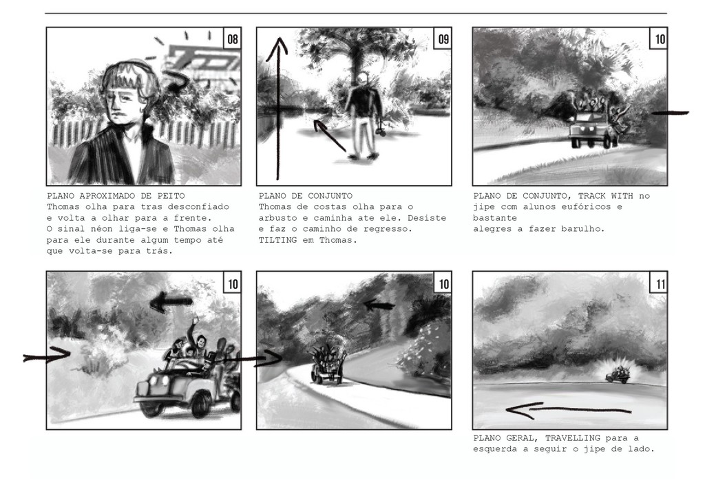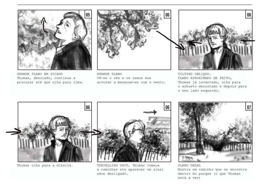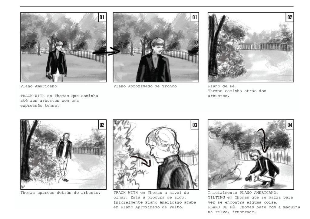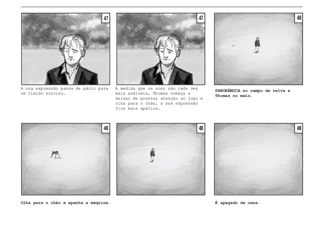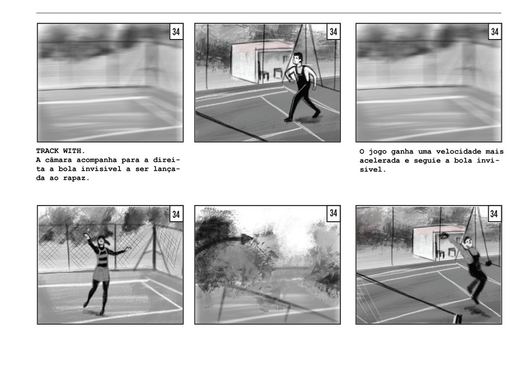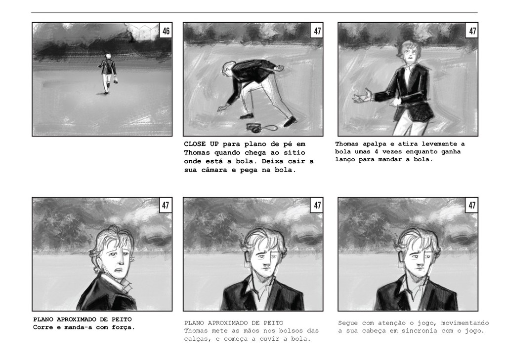 PLANO GERAL fora do campo. Vemos o jogo pelo lado dos amigos, que celebram e agitam a rede pela vitória da sua amiga, sem fazer um som. O jogo retoma, com a rapariga a servir. PLANO GERAL fora do campo, à altura de Thomas. Vemos o jogo pelo lado de Thomas, que se encontra encostado à rede. Os jogadores batem a bola duas vezes. PLANO GERAL fora do campo, à altura de Thomas. Na segunda vez em que o rapaz manda a bola, a rapariga corre em direção a ela, e Thomas segue a bola com a cabeça, mas a mesma acaba por sair do campo. TRACK WITH no grande arco imag- inário da bola, até ela bater no chãoe e rebolar mais um pouco até parar no meio da relva. 40 41 42 42 43 43