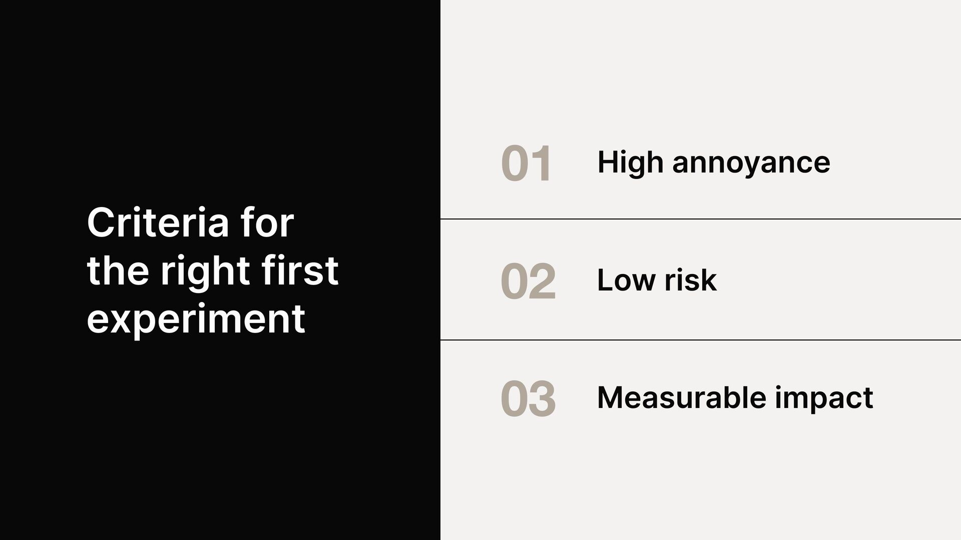 zone and three criteria. De fi ne success criteria before breaking dirt. Use existing tools when possible. Aim for hours, not weeks. Track technical stats and team satisfaction. Decide quickly: promote, iterate, or shelve.