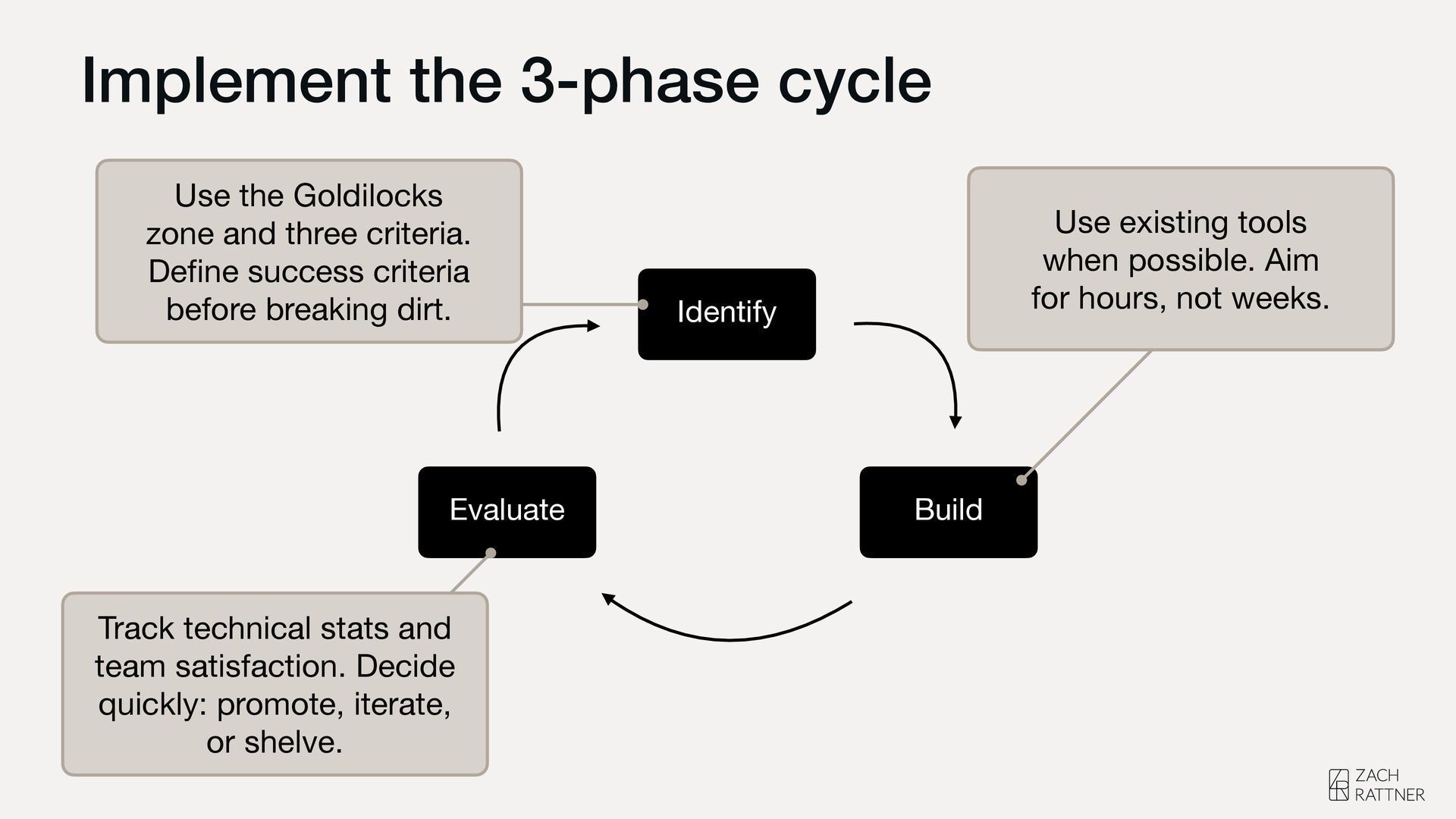 Implement the 3-phase cycle Identify Build Evaluate Use the Goldilocks