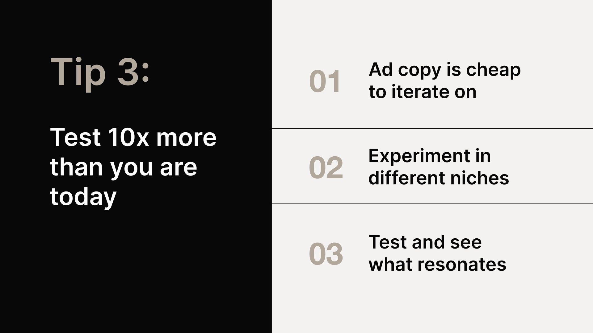 di ff erent niches Test and see what resonates 2 3 Tip 3: Test 10x more than you are today