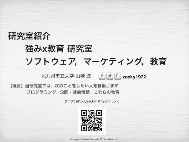 $PQZSJHIU4VTVNV:BNB[BLJ "MM3JHIUT3FTFSWFE zacky1972 भࢢཱେֶ ࢁ࡚ ਐ ݚڀࣨհ ɹɹڧΈYڭҭݚڀࣨ ɹɹιϑτΣΞɼϚʔέςΟϯάɼڭҭ ʲ֓ཁʳݚڀࣨͰɼ࣍ͷ͜ͱΛ͍ͨ͠ਓΛืू͠·͢