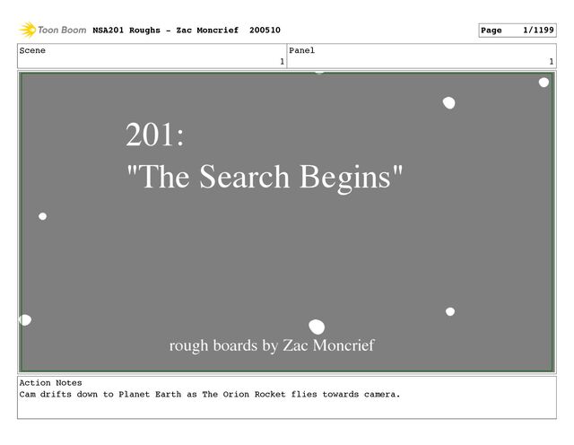 the moon (moon is getting closer to cam as it rotates). rocket is slowly gaining in shot throughout. The Rocket pulls off to the left after a beat NSA201 Roughs - Zac Moncrief 200510 Page 59/1199
