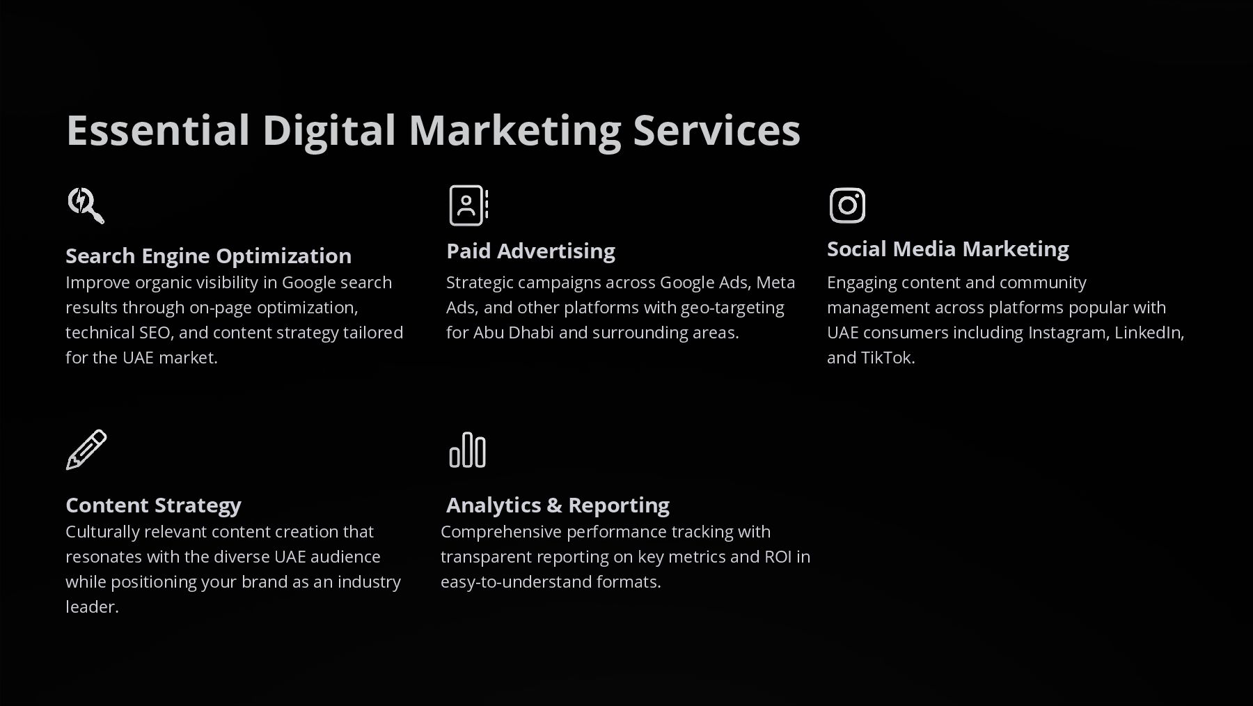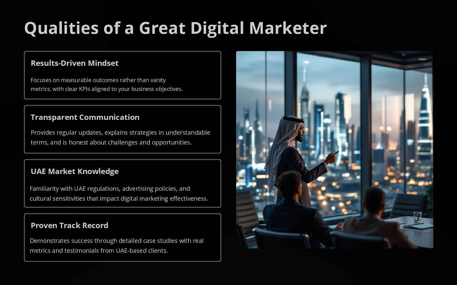 Whether you run a startup or an established business in the UAE, this deck provides everything you need to choose the right marketing partner and scale confidently.