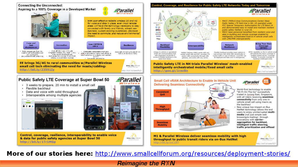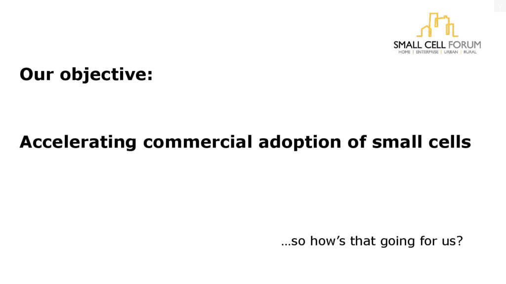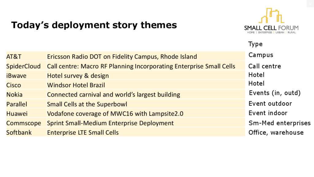 their small cell deployments are bringing value to consumers and businesses Building market awareness & confidence sharing market progress and success stories Format: 5min prez+5min Q&A Slides will be available at smallcellforum.org