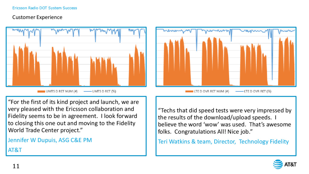 first of its kind project and launch, we are very pleased with the Ericsson collaboration and Fidelity seems to be in agreement. I look forward to closing this one out and moving to the Fidelity World Trade Center project.” Jennifer W Dupuis, ASG C&E PM AT&T “Techs that did speed tests were very impressed by the results of the download/upload speeds. I believe the word ‘wow’ was used. That’s awesome folks. Congratulations All! Nice job.” Teri Watkins & team, Director, Technology Fidelity