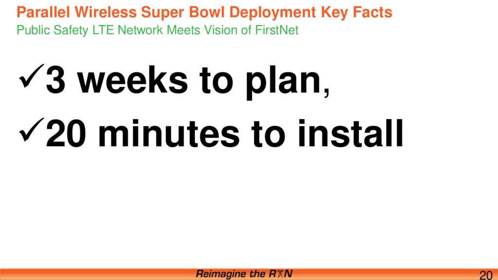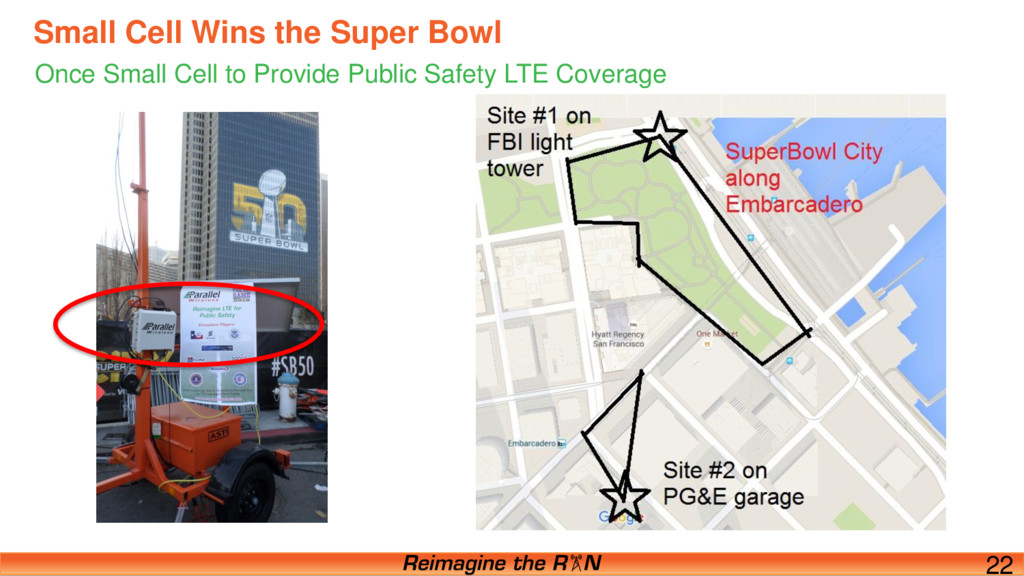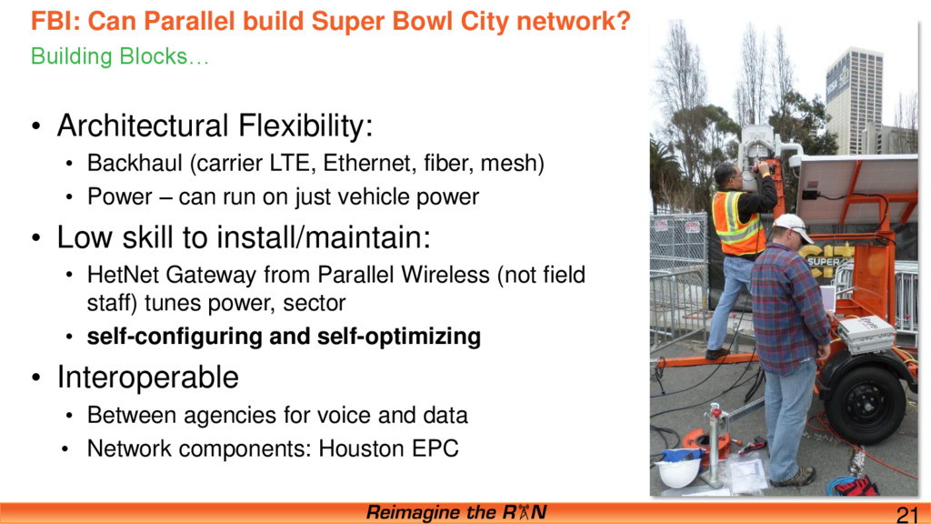 21 • Architectural Flexibility: • Backhaul (carrier LTE, Ethernet, fiber, mesh) • Power – can run on just vehicle power • Low skill to install/maintain: • HetNet Gateway from Parallel Wireless (not field staff) tunes power, sector • self-configuring and self-optimizing • Interoperable • Between agencies for voice and data • Network components: Houston EPC