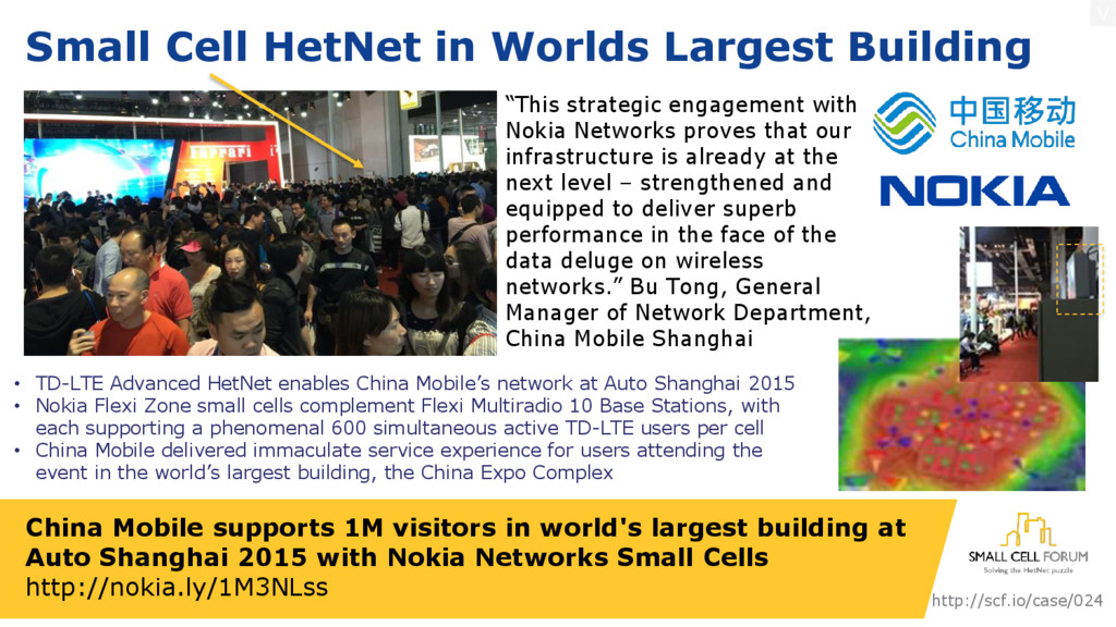 at Auto Shanghai 2015 with Nokia Networks Small Cells http://nokia.ly/1M3NLss • TD-LTE Advanced HetNet enables China Mobile’s network at Auto Shanghai 2015 • Nokia Flexi Zone small cells complement Flexi Multiradio 10 Base Stations, with each supporting a phenomenal 600 simultaneous active TD-LTE users per cell • China Mobile delivered immaculate service experience for users attending the event in the world’s largest building, the China Expo Complex Small Cell HetNet in Worlds Largest Building “This strategic engagement with Nokia Networks proves that our infrastructure is already at the next level – strengthened and equipped to deliver superb performance in the face of the data deluge on wireless networks.” Bu Tong, General Manager of Network Department, China Mobile Shanghai http://scf.io/case/024