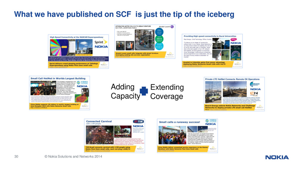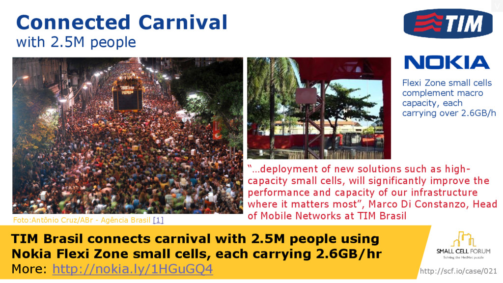 Flexi Zone small cells, each carrying 2.6GB/hr More: http://nokia.ly/1HGuGQ4 http://scf.io/case/021 Connected Carnival with 2.5M people “…deployment of new solutions such as high- capacity small cells, will significantly improve the performance and capacity of our infrastructure where it matters most”, Marco Di Constanzo, Head of Mobile Networks at TIM Brasil Flexi Zone small cells complement macro capacity, each carrying over 2.6GB/h Foto:Antônio Cruz/ABr - Agência Brasil [1]