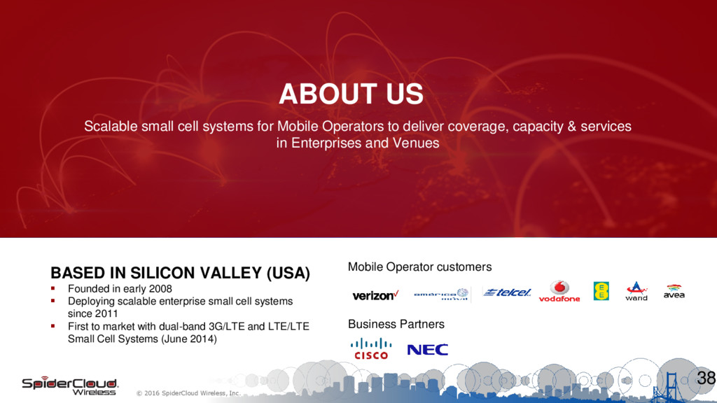 systems for Mobile Operators to deliver coverage, capacity & services in Enterprises and Venues 38 BASED IN SILICON VALLEY (USA) Founded in early 2008 Deploying scalable enterprise small cell systems since 2011 First to market with dual-band 3G/LTE and LTE/LTE Small Cell Systems (June 2014) Mobile Operator customers Business Partners