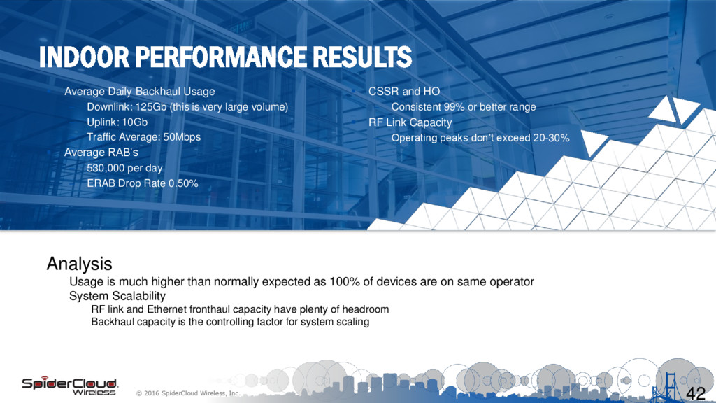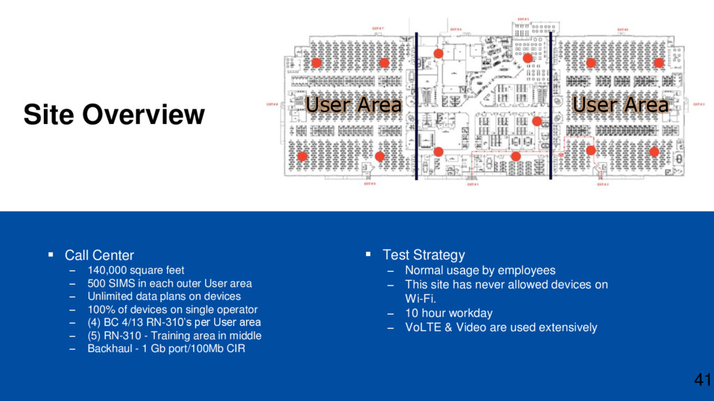 – 140,000 square feet – 500 SIMS in each outer User area – Unlimited data plans on devices – 100% of devices on single operator – (4) BC 4/13 RN-310’s per User area – (5) RN-310 - Training area in middle – Backhaul - 1 Gb port/100Mb CIR 41 User Area User Area Test Strategy – Normal usage by employees – This site has never allowed devices on Wi-Fi. – 10 hour workday – VoLTE & Video are used extensively
